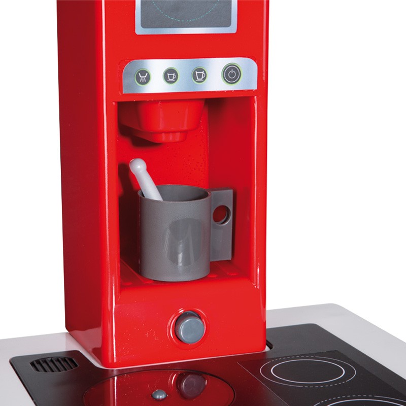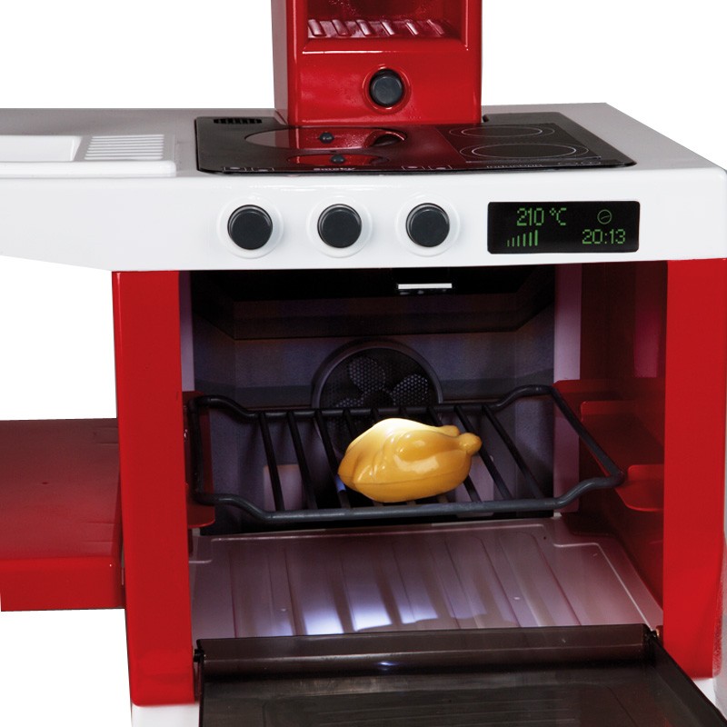 На рынке долго искала кухню, максимально интересную, с различными звуковыми эффектами. Я думала, размер будет маленький, но она вполне достойна и для игры ребенка 2.5 года отлично подходит. Ребенок в восторге, что еда по настоящему варится и жарится. А в духовке, когда нажимаешь кнопку включается тикающий таймер и свет, спустя несколько секунд раздается сигнал, как в настоящей микроволновке, что еда готова и свет включается. МИНУС: с дверцей духовки не продумано, контакт отходит, с связи с чем таймер включается только, если прижать хорошо дверцу рукой. Просто замкнули контакт и теперь духовку можно как попало закрывать, главное - нажать кнопку и таймер включится. Еще мойка уж совсем маленькая, лучше б на всю ширину плиты сделали, но радует что без отверстий она, а значит можно просто налить туда воды для еще более реалистичной игры. В общем, и целом, за такую цену в сравнении с другими детскими кухнями она просто чудесна. Ребенок играет с удовольствием.