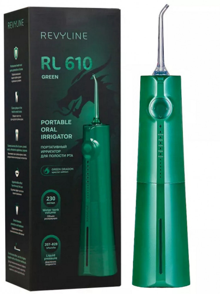 Специальный дизайн к году Зеленого Дракона — проверенный временем портативный ирригатор Revyline RL 610, который заиграл новыми красками. Ирригатор в зеленом цвете — это прекрасная возможность запастись нужными и полезными подарками к 2024 году. При всей своей компактности это мощный и функциональный прибор. Разработчики предусмотрели 5 режимов работы и 6 уровней давления жидкости для каждого: такое разнообразие режимов позволит подобрать именно тот вариант, который будет комфортен пользователю и принесет максимальную пользу здоровью. Revyline RL 610 укомплектован зарядкой USB Type-C: в данное время это самый актуальный тип разъёма. Модель имеет двойную индикацию подсветкой, упрощающую использование прибора: белый цвет отмечает выбранный режим, зеленый — уровень давления жидкости.