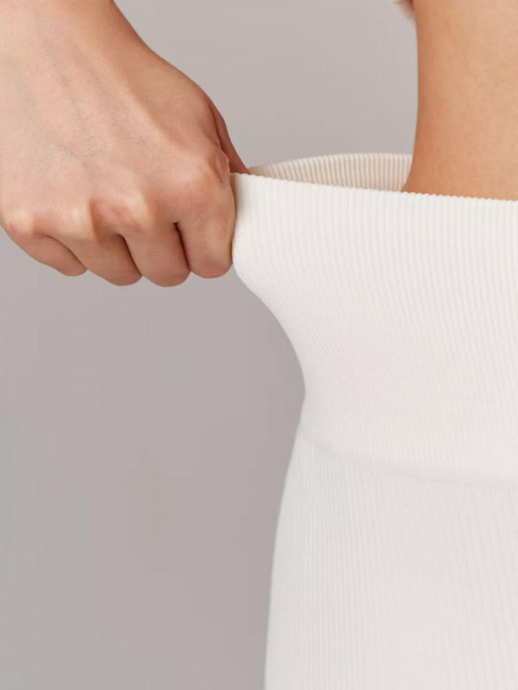 мягкая синтетическая ткань. очень хорошо тянется, сидит комфортно. белый немного просвечивает как будто, обязательно надо будет носить с бесшовным бельем телесного цвета