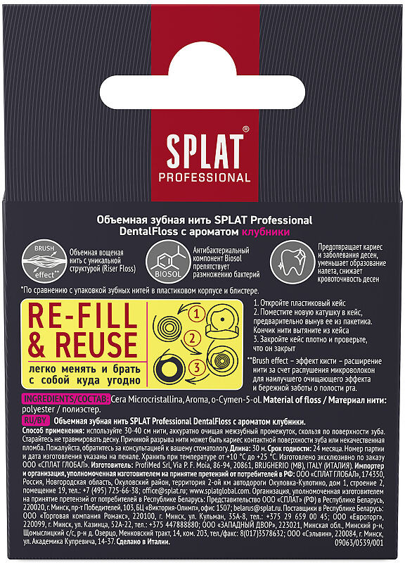 Splat Нить зубная объемная «Dental Floss»В данный момент этот товар отсутствует в продаже. Возможно, у нас найдется аналогичный или похожий товар здесь. Объемная вощеная зубная нить Dental Floss с ароматом и вкусом клубники тщательно очищает боковые поверхности зубов и межзубные промежутки. Антибактериальный компонент Biosol защищает зубы от бактерий. Волокна нити распушаются по технологии RiserFloss во время использования и бережно обрабатывают всю поверхность зуба, даже скрытую под десной. |