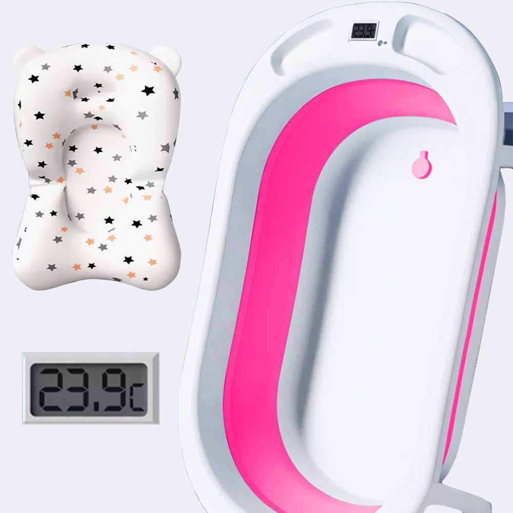 Детская складная ванночка предназначена для мытья новорожденных. Благодаря матрасику для купания, который идет в комплекте, мытье младенцев будет комфортным и безопасным. Матрас удобно крепится к бортикам ванночки и заменит горку или стульчик для купания. Во время мытья подушка надежно удерживают ребенка в лежачем положении, не давая ему скатываться. Дно ванночки имеет нескользящую поверхность. Ванночка для детей имеет встроенный электронный градусник, он измеряет и выводит температуру воды на экран, который расположен на бортике ванной. Бортики и ножки ванночки изготовлены из современного нетоксичного термопластика.