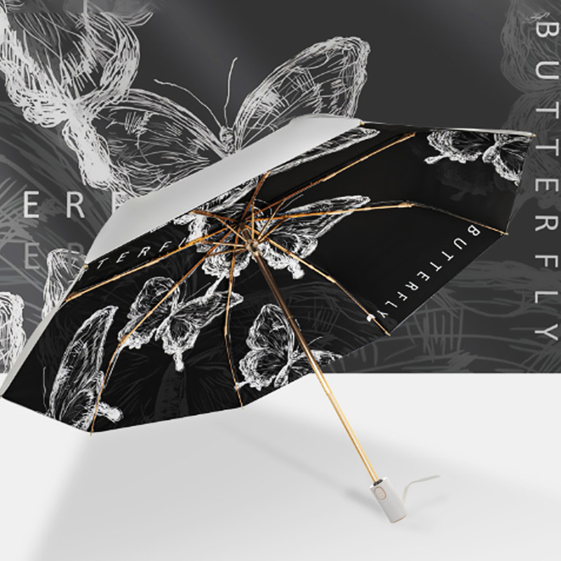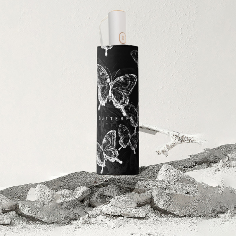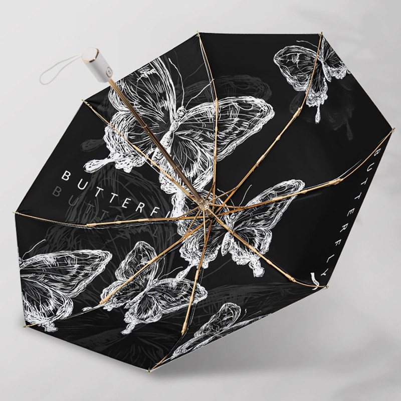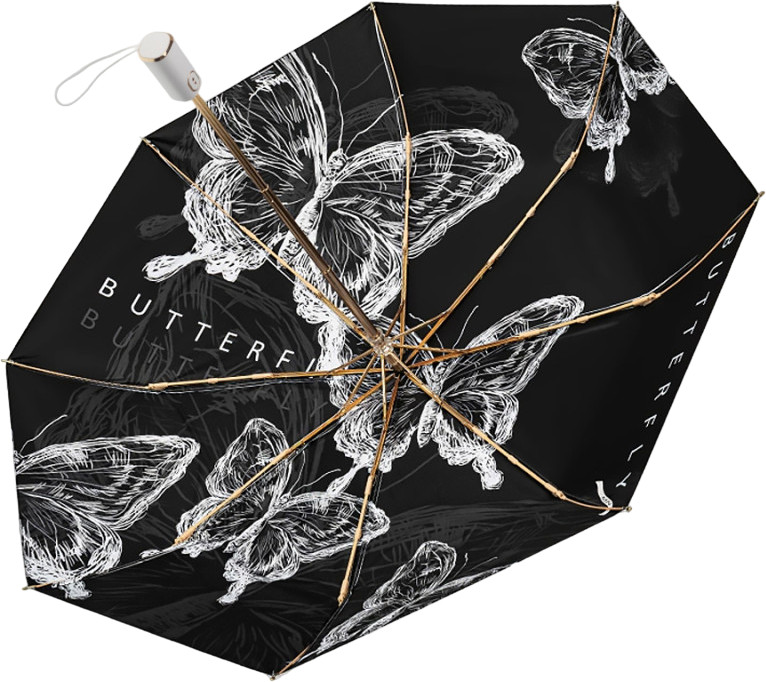 Одно из главных преимуществ этого зонта — его двусторонний дизайн с принтом парящих бабочек. Черные и белые оттенки придают ему стильный и элегантный вид, а интересный рисунок добавляет изюминку. Вы сможете подчеркнуть свою индивидуальность и стать настоящим центром внимания с таким зонтом.