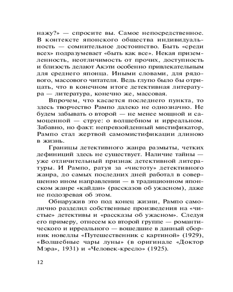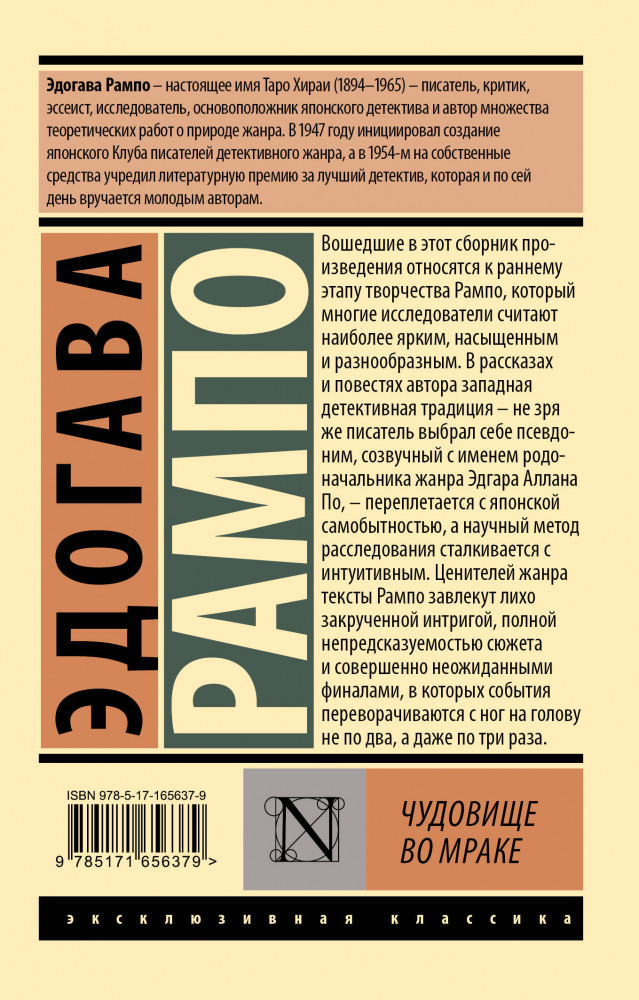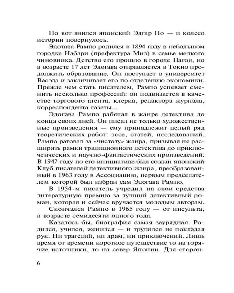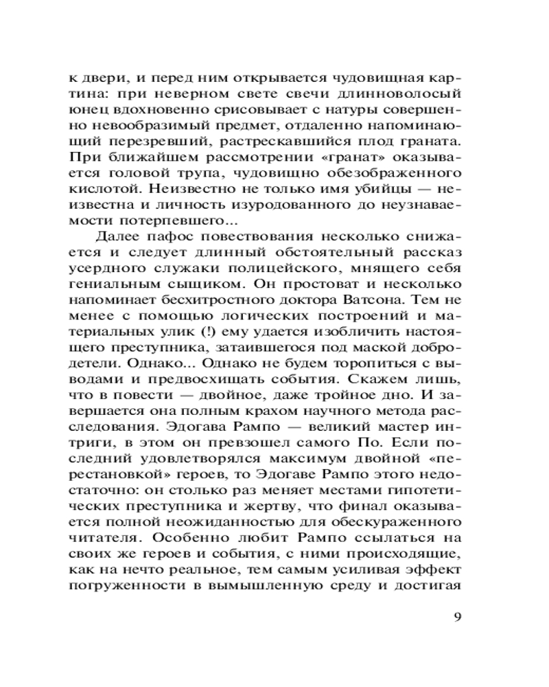 💳 Оплатить за товар можно при получении 🇰🇿 Есть бесплатная доставка по Казахстану от 1 дня 🎁 Копите бонусы с каждой покупки Серия: Эксклюзивная классика Вошедшие в этот сборник произведения относятся к раннему этапу творчества Рампо, который многие исследователи считают наиболее ярким, насыщенным и разнообразным. В рассказах и повестях автора западная детективная традиция — не зря же писатель выбрал себе псевдоним, созвучный с именем родоначальника жанра Эдгара Аллана По, — переплетается с японской самобытностью, а научный метод расследования сталкивается с интуитивным. Ценителей жанра тексты Рампо завлекут лихо закрученной интригой, полной непредсказуемостью сюжета и совершенно неожиданными финалами, в которых события переворачиваются с ног на голову не по два, а даже по три раза. |