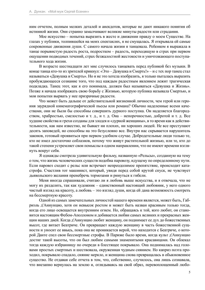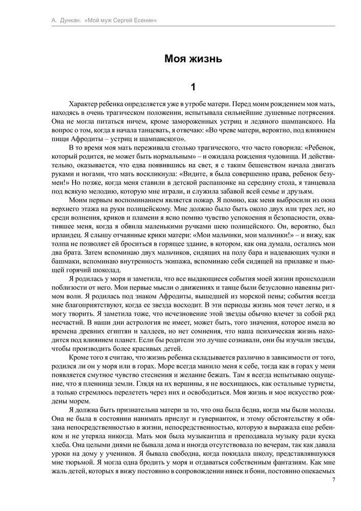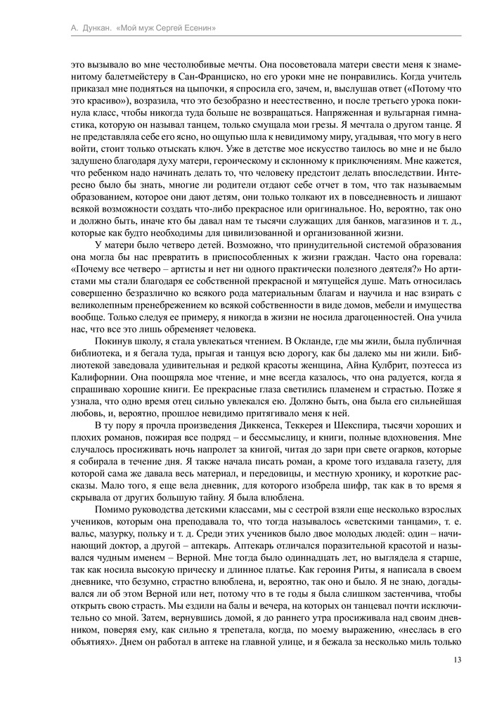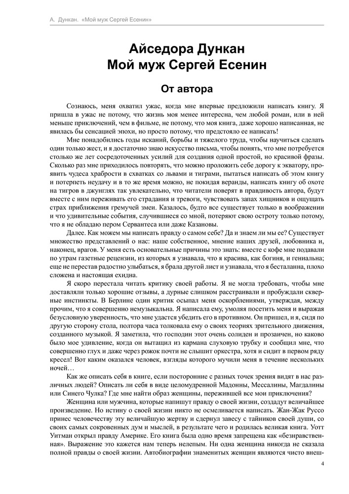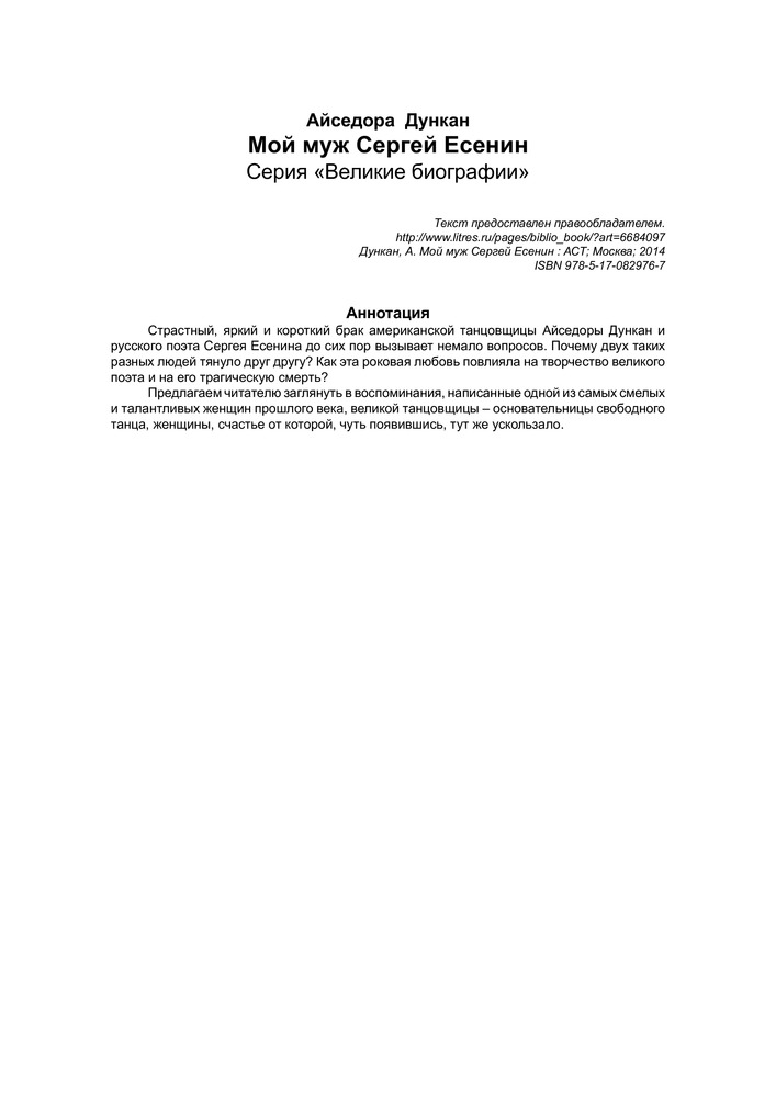 Мой муж Сергей ЕсенинВ данный момент этот товар отсутствует в продаже. Возможно, у нас найдется аналогичный или похожий товар здесь. Серия: Великие биографии Страстный, яркий и короткий брак американской танцовщицы Айседоры Дункан и русского поэта Сергея Есенина до сих пор вызывает немало вопросов. Почему двух таких разных людей тянуло друг другу? Как эта роковая любовь повлияла на творчество великого поэта и на его трагическую смерть? Предлагаем читателю заглянуть в воспоминания, написанные одной из самых смелых и талантливых женщин прошлого века, великой танцовщицы — основательницы свободного танца, женщины, счастье от которой, чуть появившись, тут же ускользало. «Женщина или мужчина, которые напишут правду о своей жизни, создадут величайшее произведение» «Я дошла до того безумного состояния, когда не могла уже жить ни с ним, ни без него» «Вместе с кофе мне подавали по утрам газетные рецензии, из которых я узнавала, что я красива, как богиня, и гениальна; еще не перестав радостно улыбаться, я брала другой лист и узнавала, что я бесталанна, плохо сложена и настоящая ехидна» «Любовь и искусство никогда не уживаются и всегда воюют» «Должны расстаться, если не хотим кончить безумием, так как наша любовь с ее психозом доведет нас до смерти или до дома умалишенных» Айседора Дункан. |