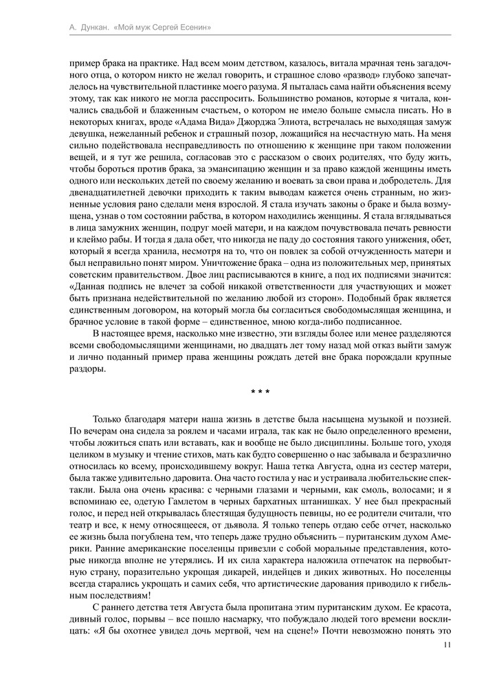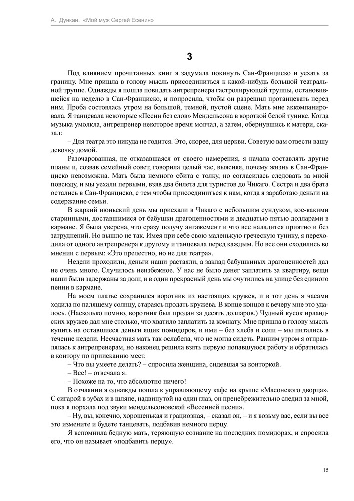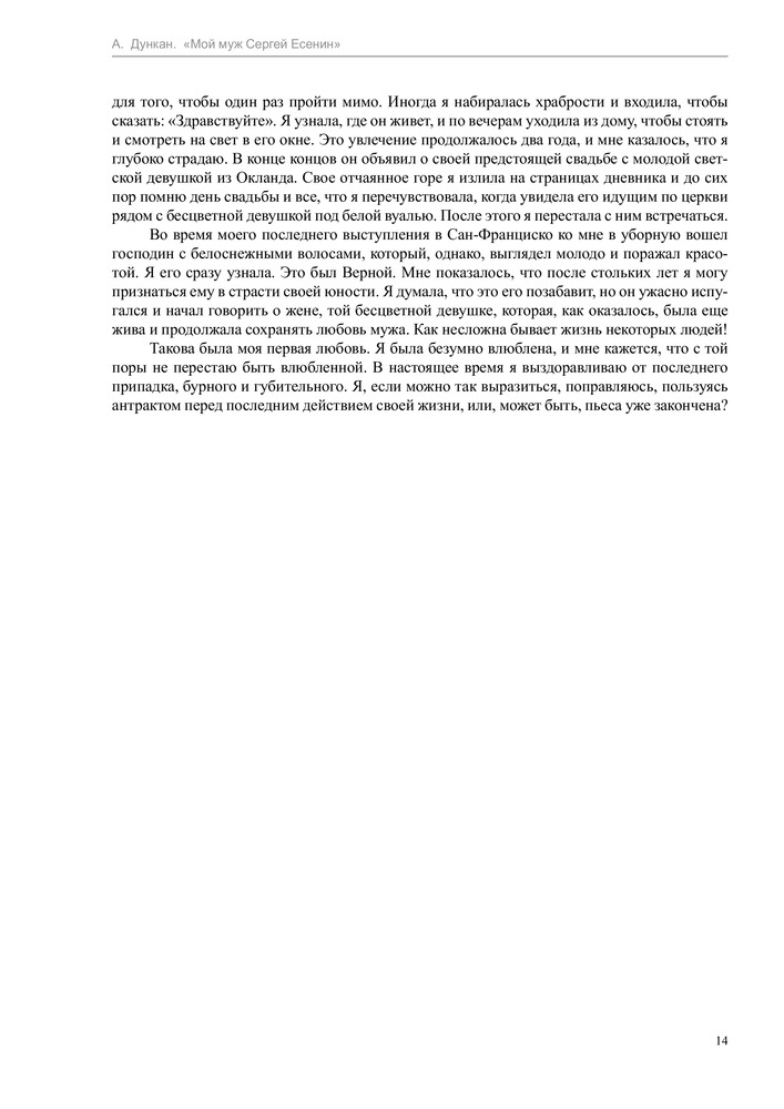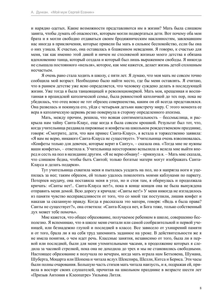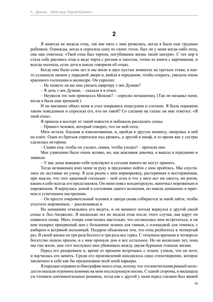 Мой муж Сергей ЕсенинВ данный момент этот товар отсутствует в продаже. Возможно, у нас найдется аналогичный или похожий товар здесь. Серия: Великие биографии Страстный, яркий и короткий брак американской танцовщицы Айседоры Дункан и русского поэта Сергея Есенина до сих пор вызывает немало вопросов. Почему двух таких разных людей тянуло друг другу? Как эта роковая любовь повлияла на творчество великого поэта и на его трагическую смерть? Предлагаем читателю заглянуть в воспоминания, написанные одной из самых смелых и талантливых женщин прошлого века, великой танцовщицы — основательницы свободного танца, женщины, счастье от которой, чуть появившись, тут же ускользало. «Женщина или мужчина, которые напишут правду о своей жизни, создадут величайшее произведение» «Я дошла до того безумного состояния, когда не могла уже жить ни с ним, ни без него» «Вместе с кофе мне подавали по утрам газетные рецензии, из которых я узнавала, что я красива, как богиня, и гениальна; еще не перестав радостно улыбаться, я брала другой лист и узнавала, что я бесталанна, плохо сложена и настоящая ехидна» «Любовь и искусство никогда не уживаются и всегда воюют» «Должны расстаться, если не хотим кончить безумием, так как наша любовь с ее психозом доведет нас до смерти или до дома умалишенных» Айседора Дункан. |