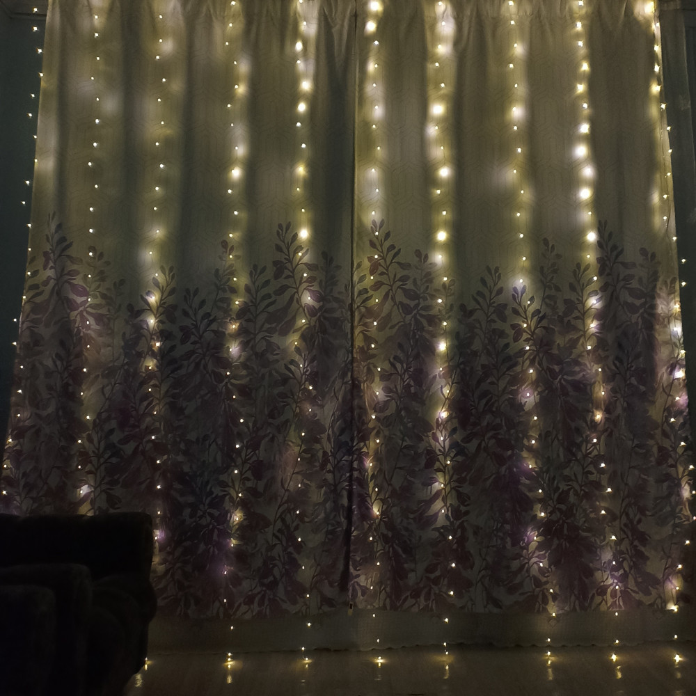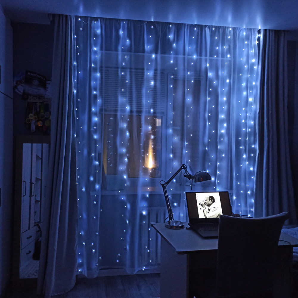 Всегда мечтала иметь как можно больше светящихся элементов в доме для создания новогоднего настроения! Решила, что украшу гирляндами-шторами. В каталоге было два цвета: желтый и белый, но иногда встречаются разноцветные. Каждый проводок гирлянды скручен и перевязан небольшим кусочком проволоки. Лучше сначала подвесить гирлянду на штору, а потом разматывать проводки, так не спутаются проводки! Всего 10 проводков. Все вместе они дают тот самый эффект новогоднего настроения. Есть несколько режимов: медленное угасание, попеременное мигание (таких несколько), статичный свет и сумасшедшее мигание. Переключать режим можно с помощью пульта. Чтобы подвесить гирлянду к шторе или карнизу есть пластмассовые крючки.