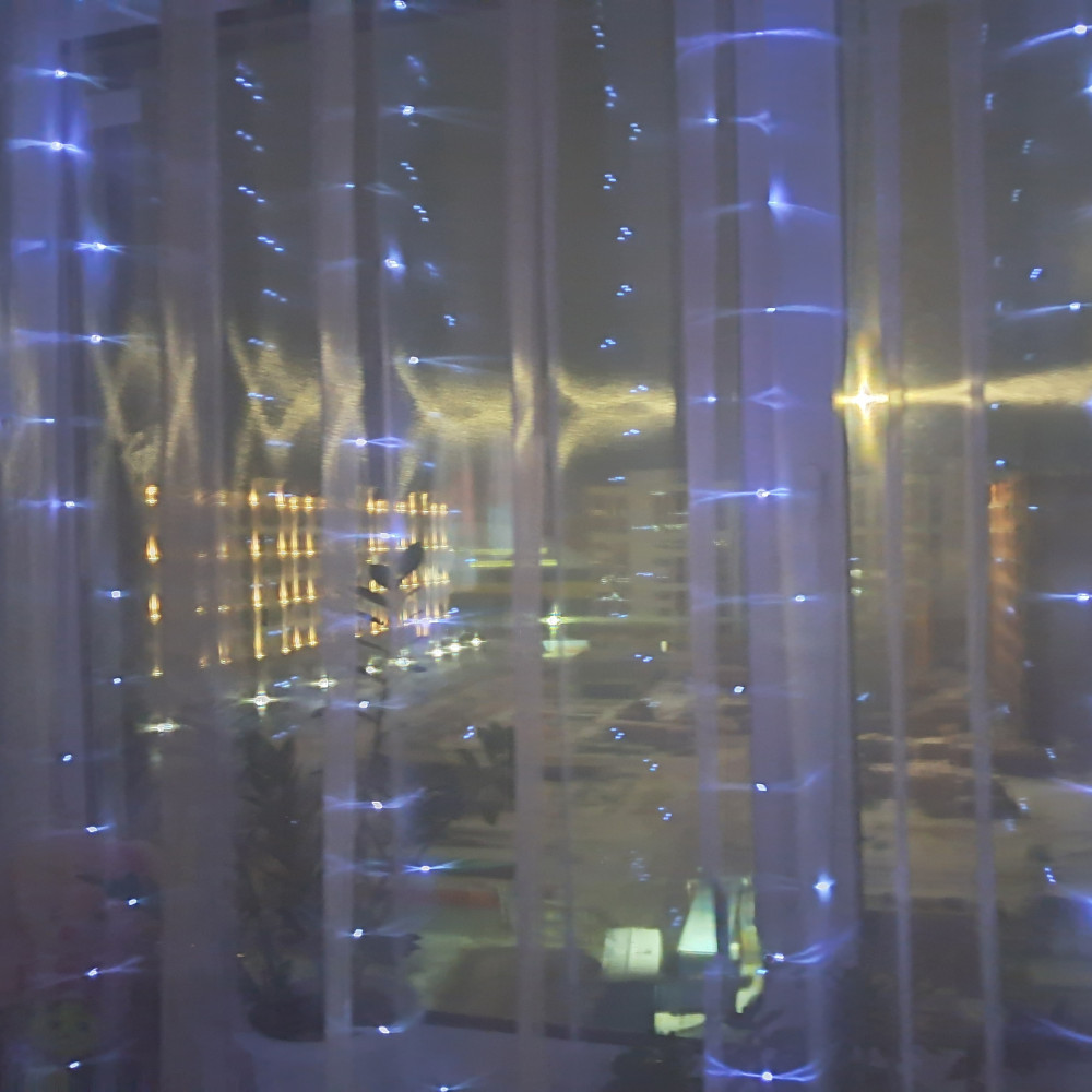 Купила гирлянду с белым цветом и прогадала, лучше брать с жёлтым, тёплым светом! Лампочки гирлянды на голой проволоке. Думаю, что долго не проработают, перегорят. Снять гирлянду-штору – задачка не из простых. Надо смотать каждый проводок, потом уложить всё это в коробку так, чтобы на следующий год без проблем достать.