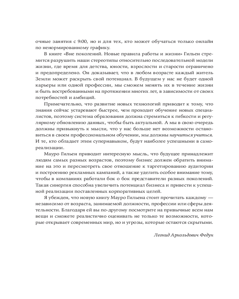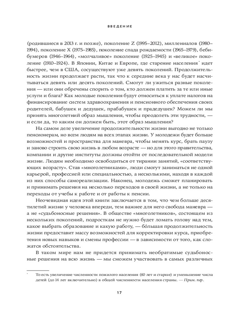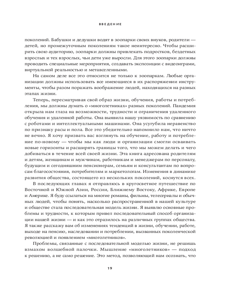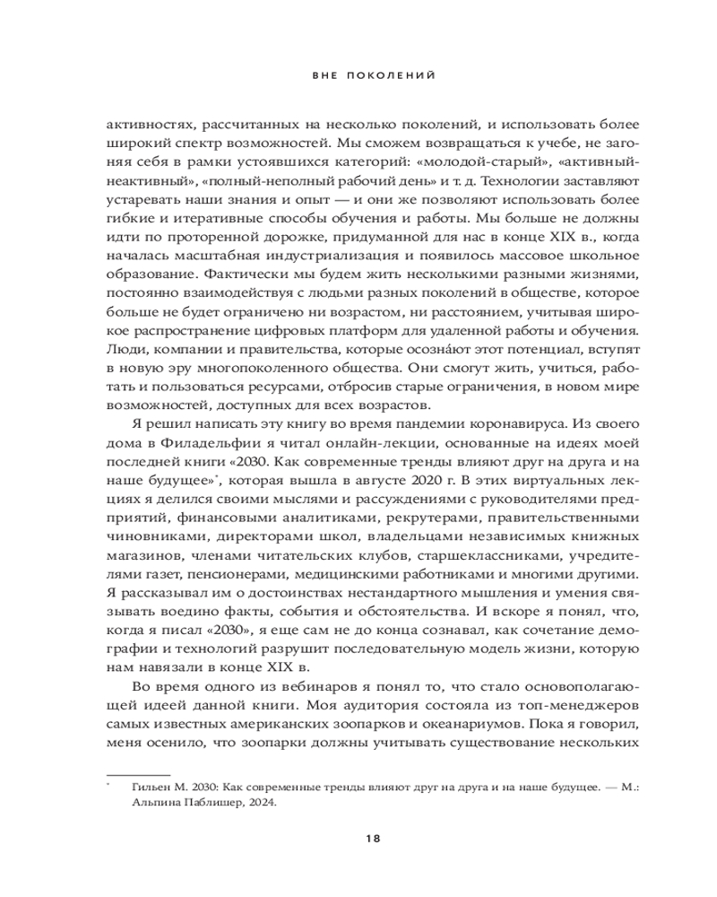 В своей книге «Вне поколений. Новые правила работы и жизни» Мауро Гильен, автор бестселлера «2030. Как современные тренды влияют друг на друга и на наше будущее», предлагает увлекательное исследование феномена «многолетников» и его влияния на все сферы жизни. Гильен доказывает, что привычная модель «учеба-работа-пенсия» устарела. «Многолетники» не боятся менять профессию, учиться новому и сохранять активность в любом возрасте.