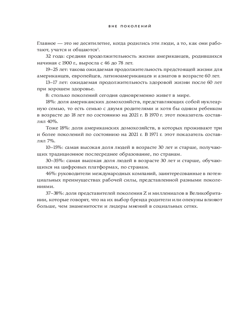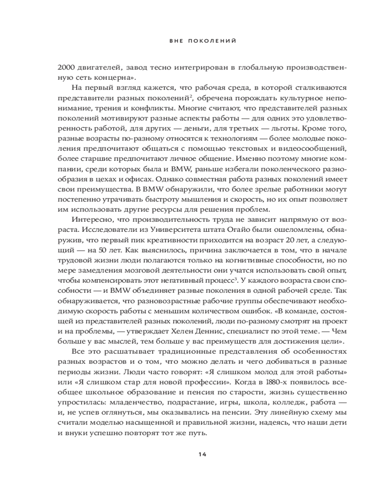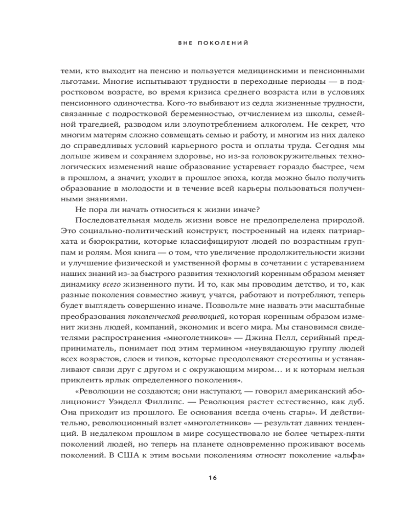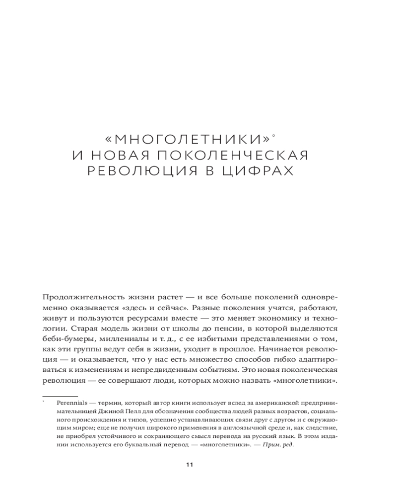В своей книге «Вне поколений. Новые правила работы и жизни» Мауро Гильен, автор бестселлера «2030. Как современные тренды влияют друг на друга и на наше будущее», предлагает увлекательное исследование феномена «многолетников» и его влияния на все сферы жизни. Гильен доказывает, что привычная модель «учеба-работа-пенсия» устарела. «Многолетники» не боятся менять профессию, учиться новому и сохранять активность в любом возрасте.