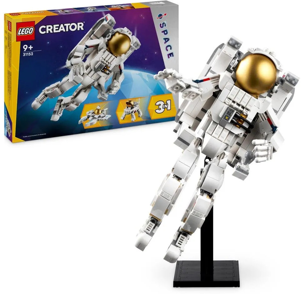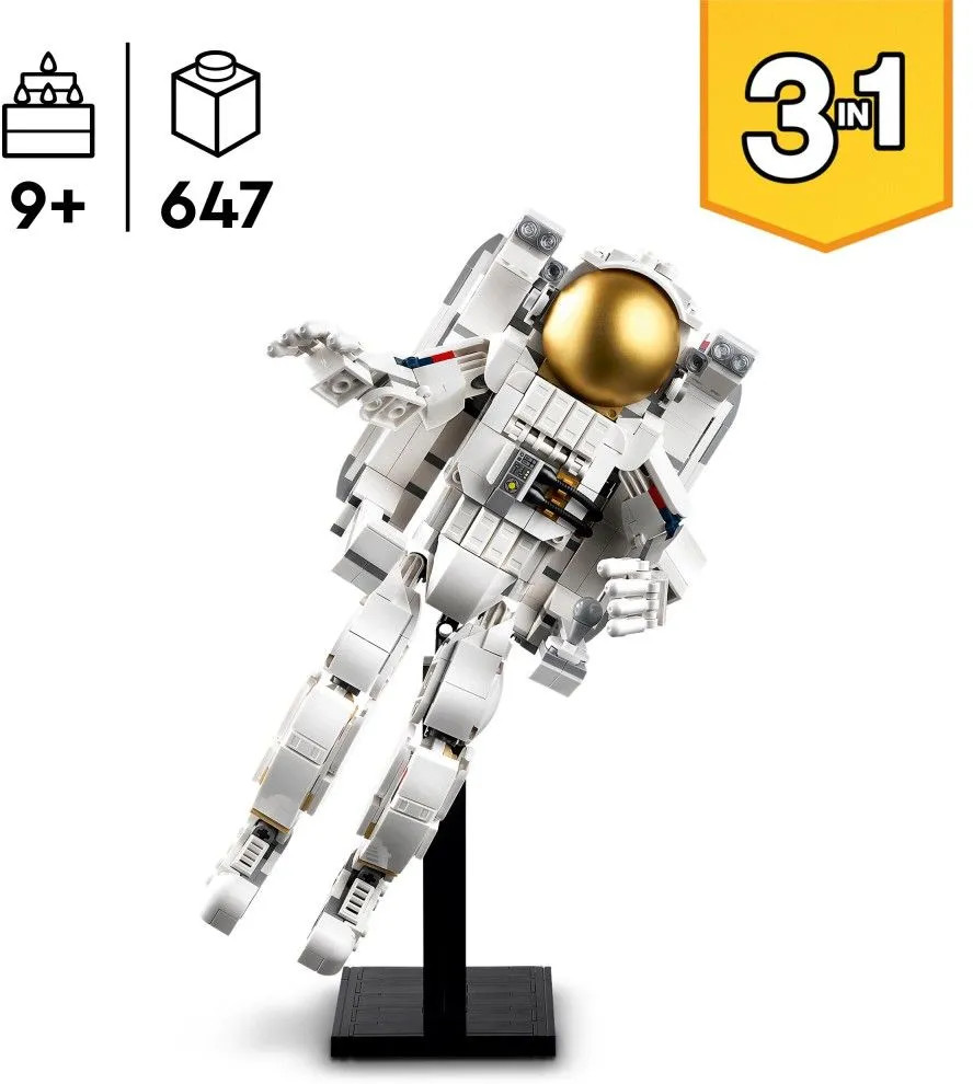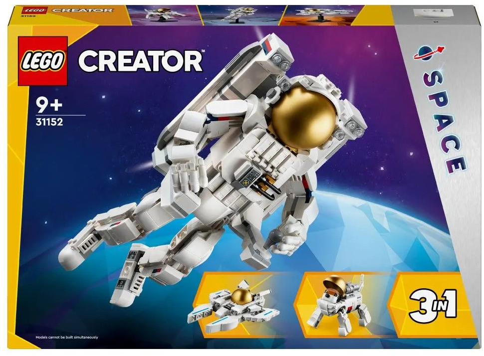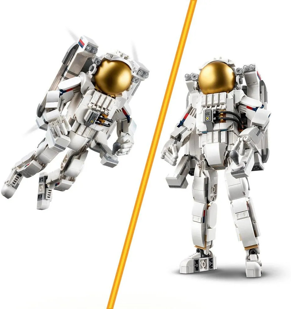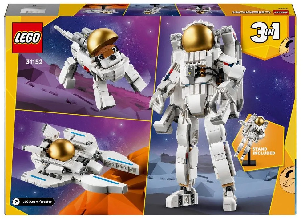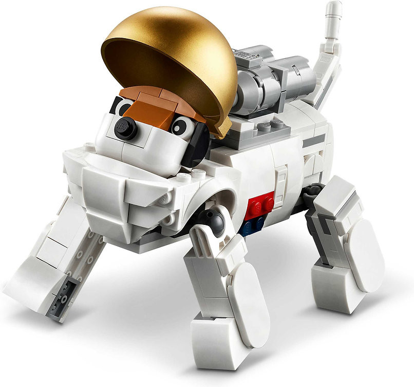 Три космических игрушки Lego в одной коробке — любящие космос дети в возрасте от 9 лет и старше могут собрать и перестроить три разные модели, используя одни и те же кубики из набора Lego Creator «Астронавт». Множество вариантов игры: дети могут разыгрывать захватывающие космические истории с тремя моделями: фигуркой космонавта, космической собакой и космическим самолетом. Подвижные фигурки: у космонавта подвижные ноги, ступни, руки и пальцы, а у космической собаки подвижные хвост и лапы, поэтому дети могут принимать их в разных позах.