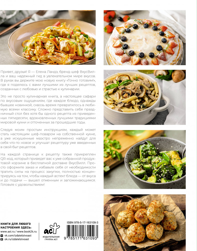 💳 Оплатить за товар можно при получении 🇰🇿 Есть бесплатная доставка по Казахстану от 1 дня 🎁 Копите бонусы с каждой покупки Серия: Дело вкуса Привет, друзья! Я — Елена Ландэ, бренд-шеф ВкусВилла и ваш надежный гид в увлекательном мире вкусов. В руках вы держите мою новую книгу «Точно готовим!», где я поделюсь с вами лучшими из лучших рецептов, созданными с любовью и страстью к кулинарии. Это не просто кулинарная книга, а настоящее сафари по вкусовым ощущениям, где каждое блюдо, однажды бывшее новинкой, сквозь время превратилось в любимую всеми классику. Сложно представить себе праздничный стол без хотя бы одного рецепта из приведенных пятидесяти, вдохновленных лучшими традициями мировой кухни и отточенных за прошедшие годы. |