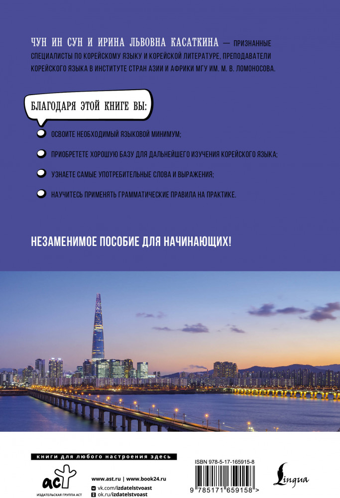 💳 Оплатить за товар можно при получении 🇰🇿 Есть бесплатная доставка по Казахстану от 1 дня 🎁 Копите бонусы с каждой покупки Серия: Базовый курс для начинающих Перед вами уникальное учебное пособие, составленное признанными специалистами в области корейского языка и культуры, преподавателями Института стран Азии и Африки МГУ Ириной Львовной Касаткиной и Чун Ин Сун. Самоучитель позволит овладеть корейским языком на уровне TOPIK 1. Каждый из 30 уроков содержит основной набор тематической лексики и необходимый грамматический материал с пояснениями, которые затем прорабатываются с помощью упражнений, диалогов, текстов для чтения и перевода. Все тексты сопровождаются словарем и лексико-грамматическими комментариями. Для удобства самостоятельной работы в конце книги помещены ответы ко всем письменным упражнениям. Особое внимание правилам чтения и корейскому письму хангыль уделяется в уроках 1–8, которые представляют собой вводно-фонетический курс. |