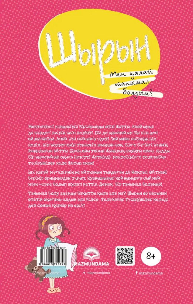 Шырын. Мен қалай танымал болдым?В данный момент этот товар отсутствует в продаже. Возможно, у нас найдется аналогичный или похожий товар здесь. Серия: Балаларға базарлық Түрік балаларының сүйікті шығармасына айналған Бирсен Еким Өзеннің «Шырын» атты кітабының басты кейіпкері Шырын — қиялы жүйрік, арманшыл, жанашыр, батыл әрі аңғал қыз. Айналасын әлі толық танып үлгермеген оған бәрі қызық, бәрі таңсық. Осы қызығушылығының әсерінен кейде үлкендерден ұрыс еститін сәттері де аз емес. Бірақ жүрегі кіршіксіз таза, қулық-сұмдықтан ада. Соңында басынан кешкен оқиғадан өзінше ой түйіп, сабақ алады. Шығарманың тілі жеңіл, ойнақы, жинақы, еріксіз езу тартқызатын юморға бай. |