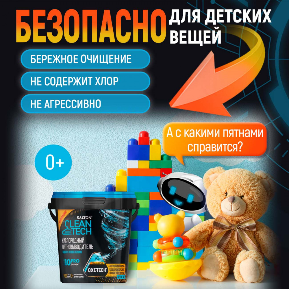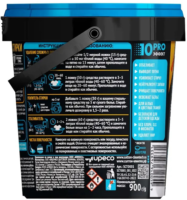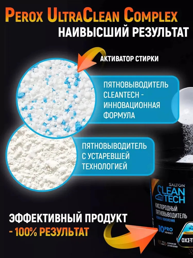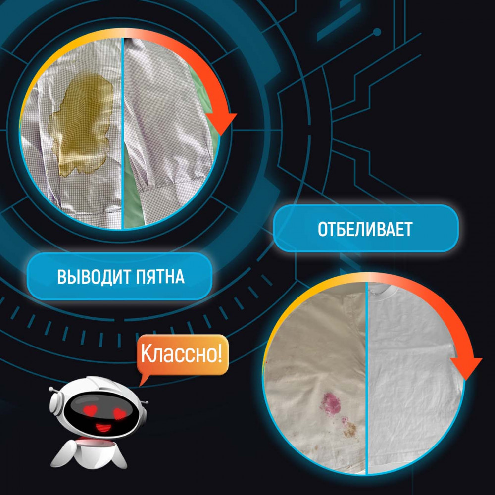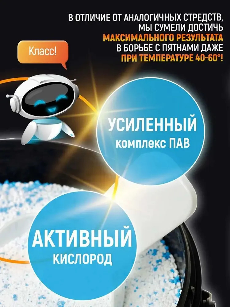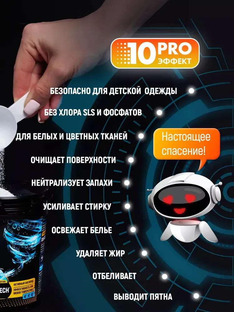Этот уникальный чистящий порошок от пятен действует в десяти направлениях: эффективно и бережно устраняет большинство трудновыводимых пятен, отбеливает, освежает белье, безопасен для стирки детской одежды, для белых и цветных тканей, без хлора, SLS и фосфатов, нейтрализует неприятные запахи, а также усиливает действие любых других стиральных средств, легко очищает поверхности, удаляет жир. Без кипятка, без агрессивной химии, без вреда для вашей одежды.