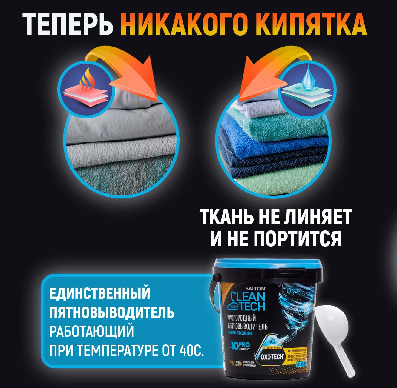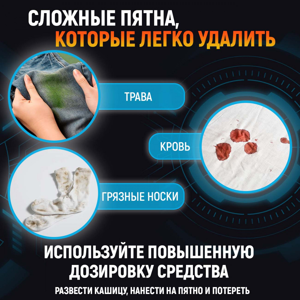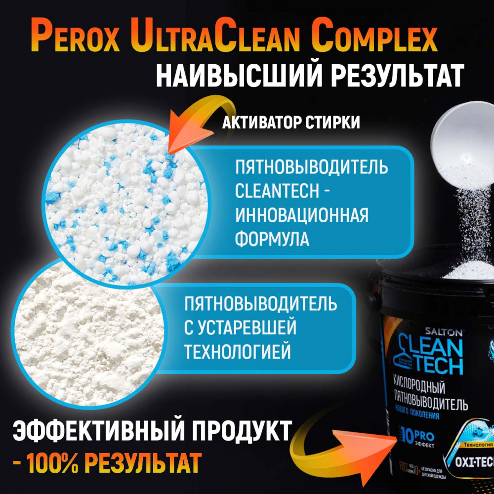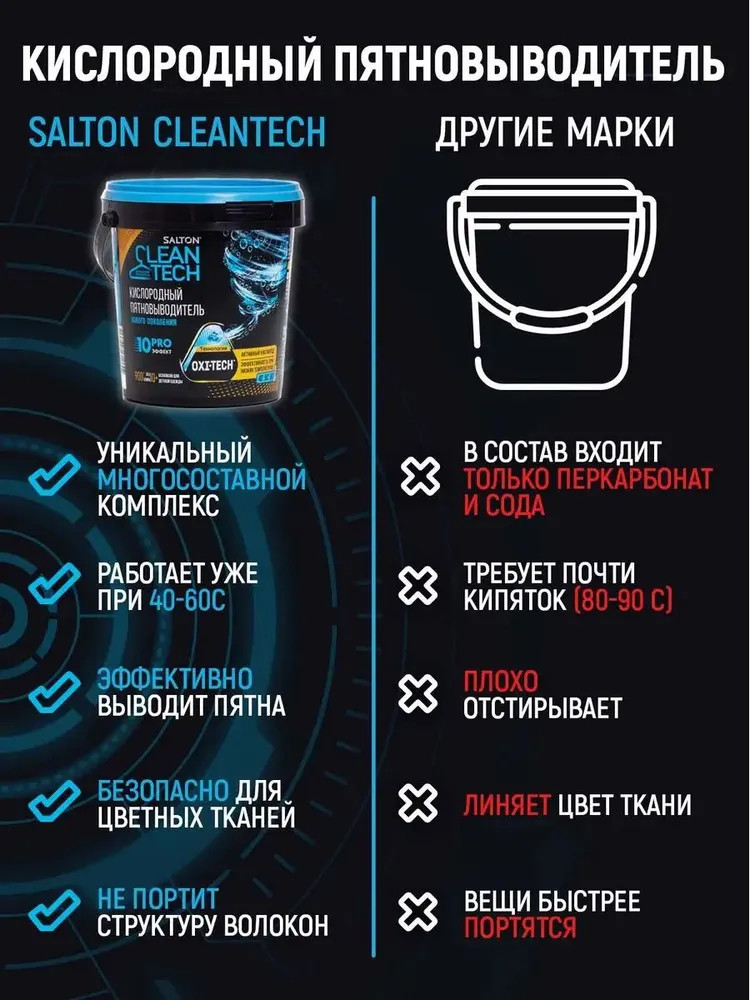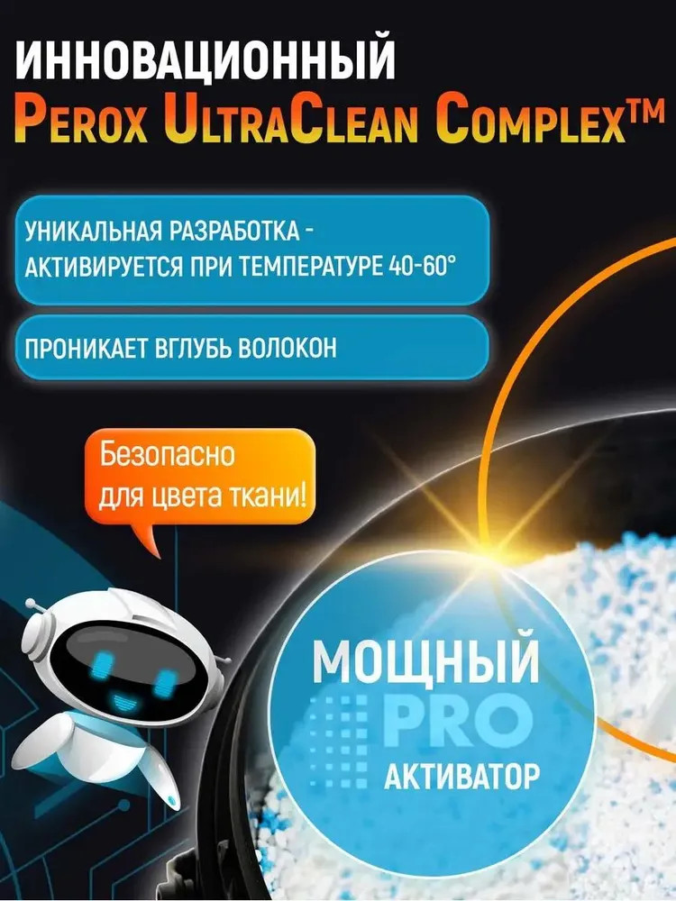 Этот уникальный чистящий порошок от пятен действует в десяти направлениях: эффективно и бережно устраняет большинство трудновыводимых пятен, отбеливает, освежает белье, безопасен для стирки детской одежды, для белых и цветных тканей, без хлора, SLS и фосфатов, нейтрализует неприятные запахи, а также усиливает действие любых других стиральных средств, легко очищает поверхности, удаляет жир. Без кипятка, без агрессивной химии, без вреда для вашей одежды.