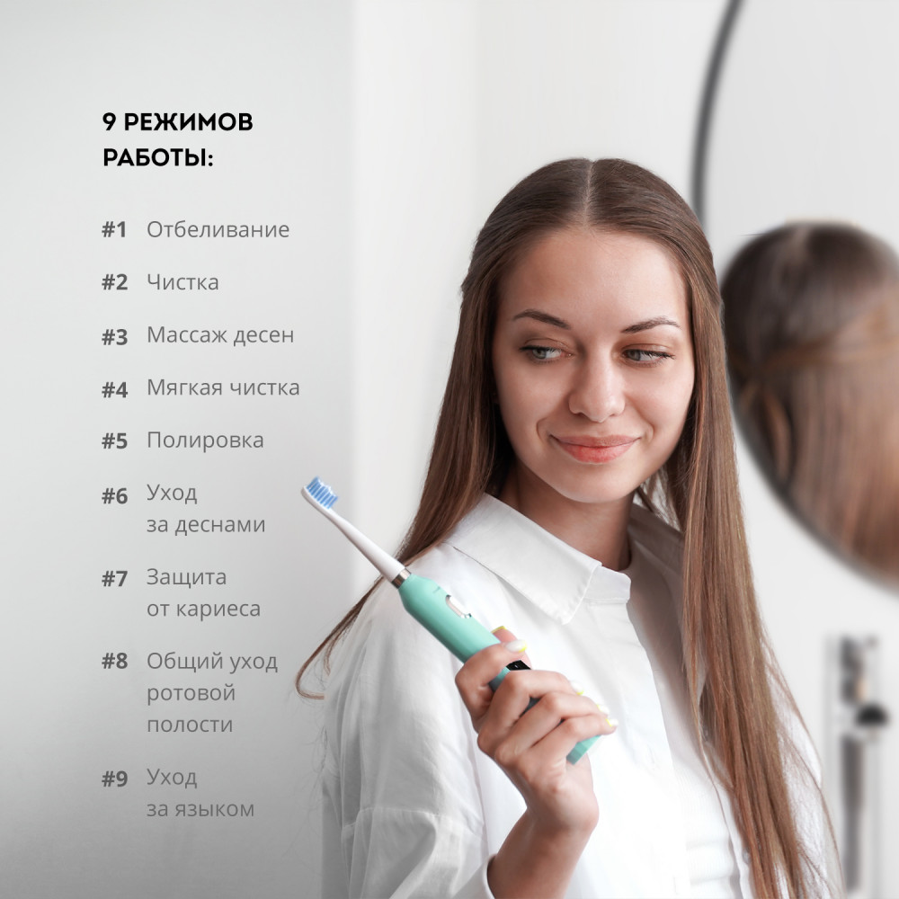 • щетка располагает девятью режимами, благодаря чему делает чистку зубов более персонализированной — отбеливание, чистка, массаж десен, мягкая чистка, полировка, уход за деснами, защита от кариеса, общий уход ротовой полости и уход за языком;