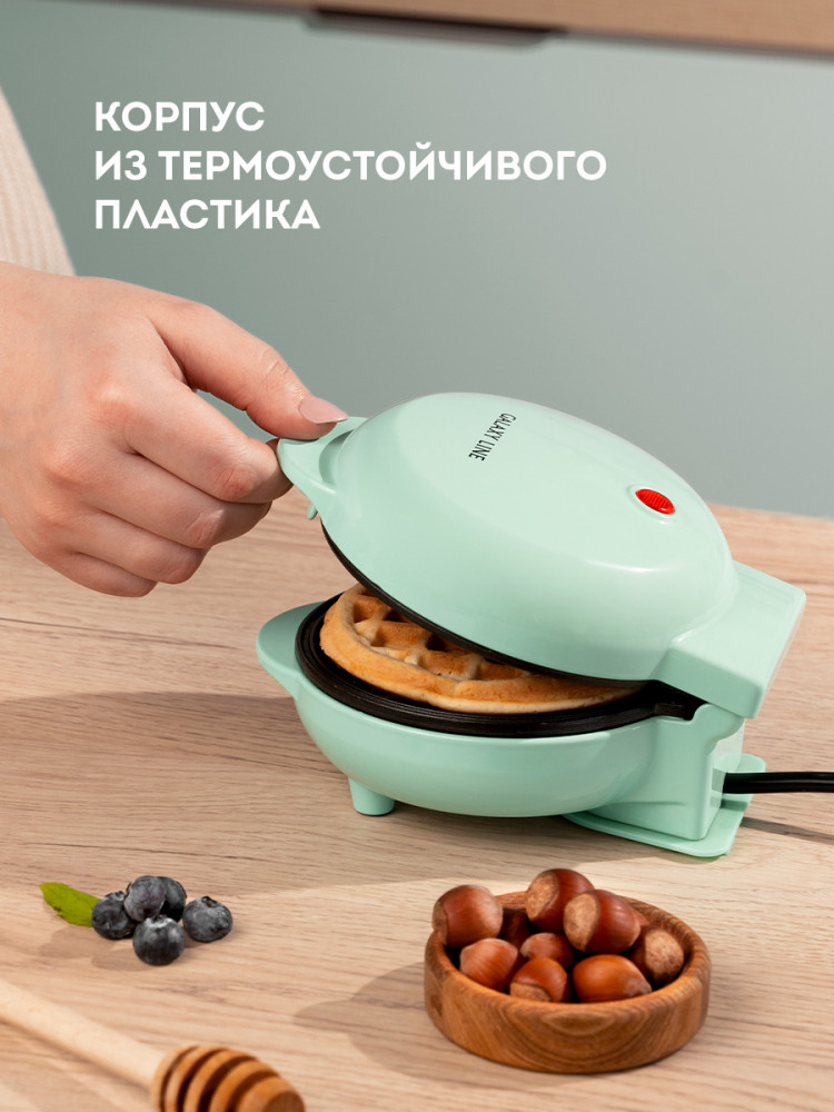 Главная особенность вафельницы заключается в процессе приготовления, который позволяет получить мягкую и воздушную структуру. Мощность прибора 800 Вт позволяет быстро разогреть рабочую поверхность и затратить минимум времени на приготовление (в среднем вафли запекаются 5-7 минут). Электровафельница Galaxy Line оснащена специальным антипригарным покрытием высокого качества, которое исключает прилипание продуктов и не требует большого количества масла. Поверхность легко чистится, обладает высокой стойкостью к температурным перепадам и механическим воздействиям. Теплоизолированный корпус вафельницы выполнен из специального жаропрочного пластика, безопасного при контакте с пищевыми продуктами. Для дополнительного удобства прибор оснащен индикатором нагрева. Длина шнура питания составляет 70 см. Силиконовые ножки надежно фиксируют прибор на рабочей поверхности, препятствуя скольжению. Благодаря компактным размерам вафельница GL2979 не займет много места на кухне. Ее удобно хранить как в горизонтальном, так и в вертикальном положении. Уникальный модный бирюзовый оттенок корпуса станет отличным ярким акцентом на Вашей кухне. Побалуйте себя и близких вкуснейшими венскими вафлями с помощью вафельницы Galaxy Line GL2979!