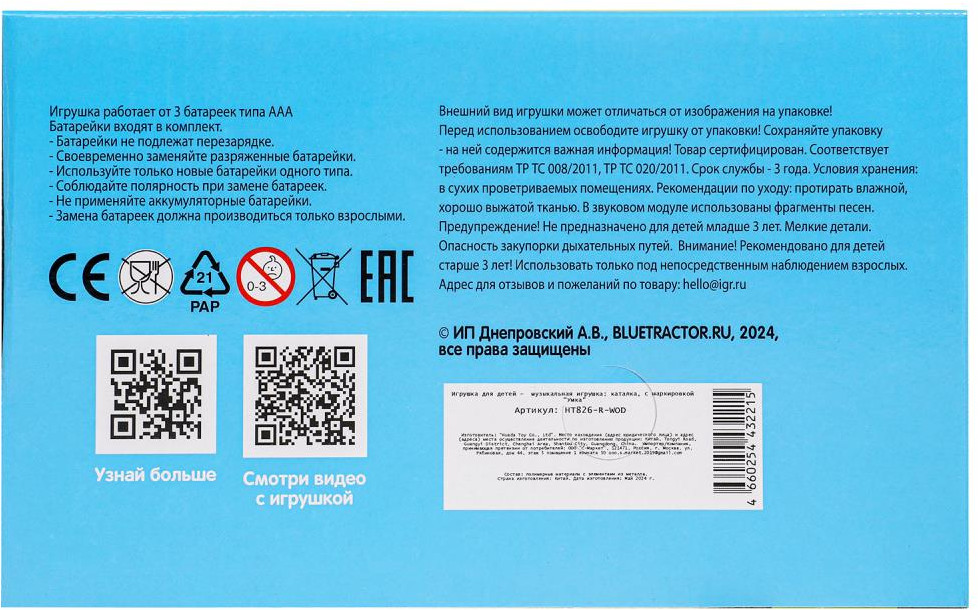 💳 Оплатить за товар можно при получении 🇰🇿 Есть бесплатная доставка по Казахстану от 1 дня 🎁 Копите бонусы с каждой покупки Серия: Синий трактор Музыкальная игрушка-каталка ТМ «УМка» станет прекрасным подарком для маленьких поклонников одноимённого мультсериала. Вашего малыша приведёт в восторг эта игрушка в виде очаровательного персонажа популярного мультфильма. Он с удовольствием будет включать и слушать любимые песенки. Кроме того, у игрушки есть колесики, и с ней можно играть как с каталкой. |