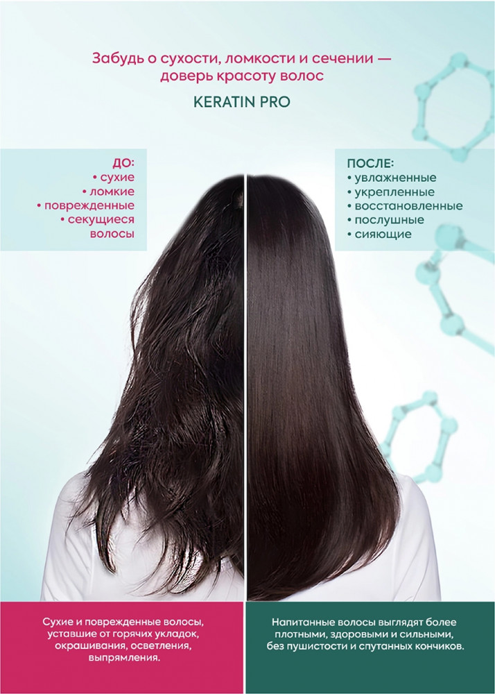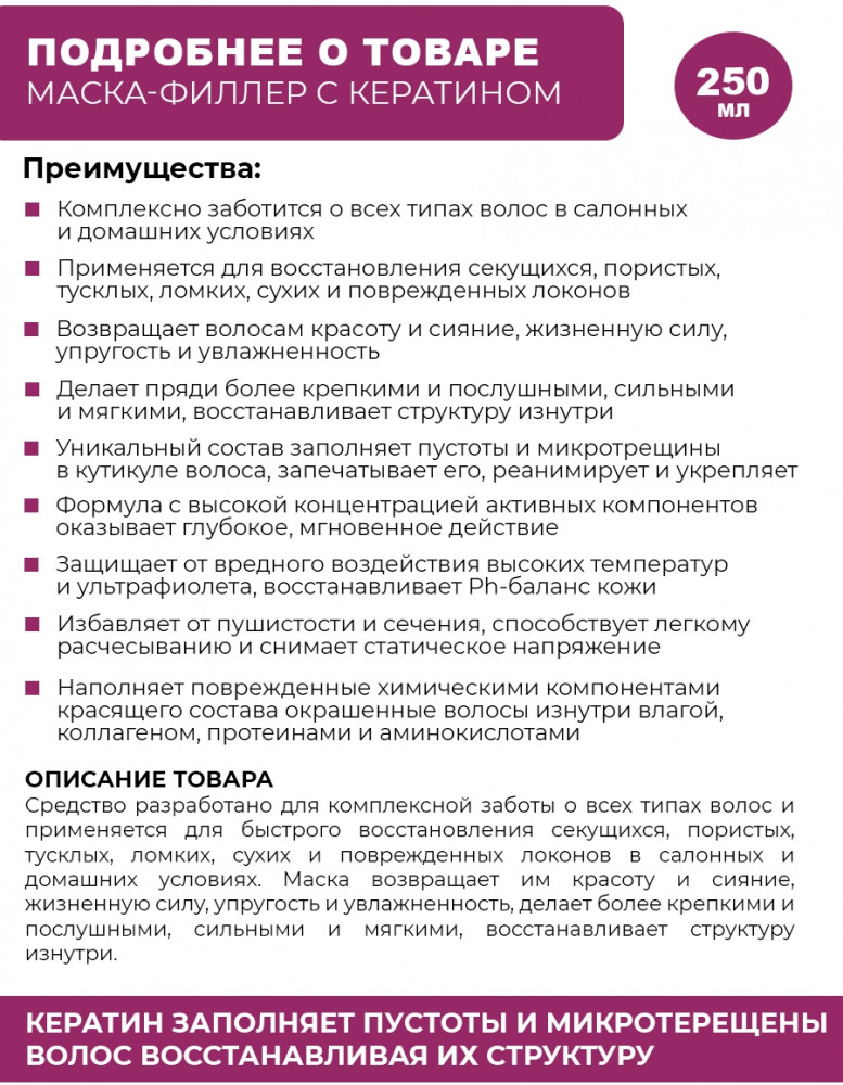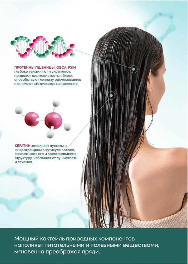 Средство разработано для комплексной заботы о всех типах волос и применяется для быстрого восстановления секущихся, пористых, тусклых, ломких, сухих и поврежденных локонов в салонных и домашних условиях. Маска возвращает им красоту и сияние, жизненную силу, упругость и увлажненность, делает более крепкими и послушными, сильными и мягкими, восстанавливает структуру изнутри.Уникальный состав с кератином и белковым коктейлем, протеинами пшеницы, овса и ржи заполняет пустоты и микротрещины в кутикуле волоса, запечатывает его, реанимирует и укрепляет локоны. Умная формула с высокой концентрацией активных компонентов оказывает глубокое, мгновенное действие на пряди: делает их плотными и эластичными, укрепляет и придает шелковистость и гладкость, избавляет от пушистости и сечения, способствует легкому расчесыванию и снимает статическое напряжение, защищает от вредного воздействия высоких температур и ультрафиолета. Взаимодополняющие друг друга компоненты формулы восстанавливают Ph-баланс кожи, усиливают рост волос и замедляют их выпадение, регенерируя структуру на клеточном уровне, благодаря чему результат сохраняется на 2-3 мытья головы.