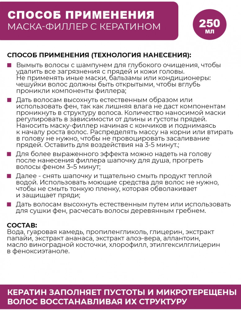Способ применения: вымыть волосы с шампунем для глубокого очищения, чтобы удалить все загрязнения с прядей и кожи головы. Не применять иные маски, бальзамы или кондиционеры: чешуйки волос должны быть открытыми, чтобы вглубь проникли компоненты филлера; Дать волосам высохнуть естественным образом или использовать фен, так как лишняя влага не даст компонентам проникнуть в структуру волоса. Количество наносимой маски регулировать в зависимости от длины и густоты прядей. Наносить маску-филлер начиная с кончиков и поднимаясь к началу роста волос. Распределять массу на корни или втирать в голову не нужно, чтобы не провоцировать засаливание прядей. Оставить для воздействия на 3-5 минут; Для более выраженного эффекта можно надеть на голову после нанесения филлера шапочку для душа, прогреть волосы феном 3–5 минут; Далее — снять шапочку и тщательно смыть продукт теплой водой. Использовать моющие средства для волос не нужно, чтобы не смыть тонкую пленку, которая обволакивает и защищает пряди; Дать волосам высохнуть естественным путем или использовать для сушки фен, расчесать волосы деревянным гребнем.