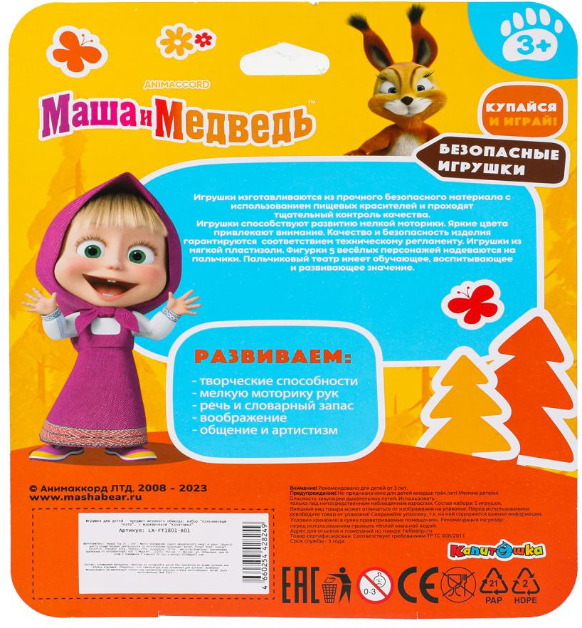 💳 Оплатить за товар можно при получении 🇰🇿 Есть бесплатная доставка по Казахстану от 1 дня 🎁 Копите бонусы с каждой покупки Серия: Маша и Медведь Игрушка из пластизоля для ванны — пальчиковый театр «Маша и Медведь» ТМ «Капитошка» — отличный подарок для маленьких поклонников одноимённого мультсериала. Ребёнок с удовольствием будет играть с яркими фигурками героев популярного мультфильма и устраивать с ними пальчиковые театральные представления. Родители также могут принимать активное участие в таких постановках — фигурки подходят как для детских, так и для взрослых пальцев. Красочная расцветка и детальная проработка фигурок привлекут внимание малыша и сделают игру весёлой и интересной. |