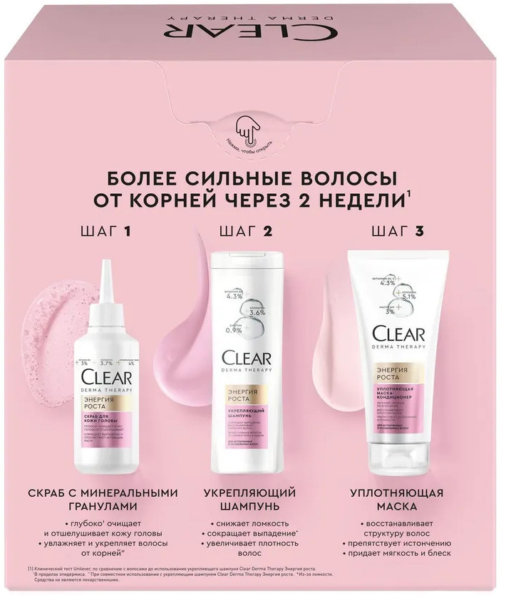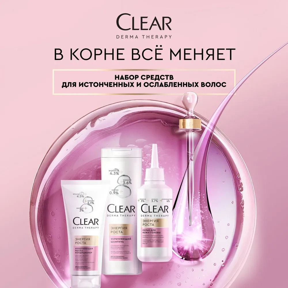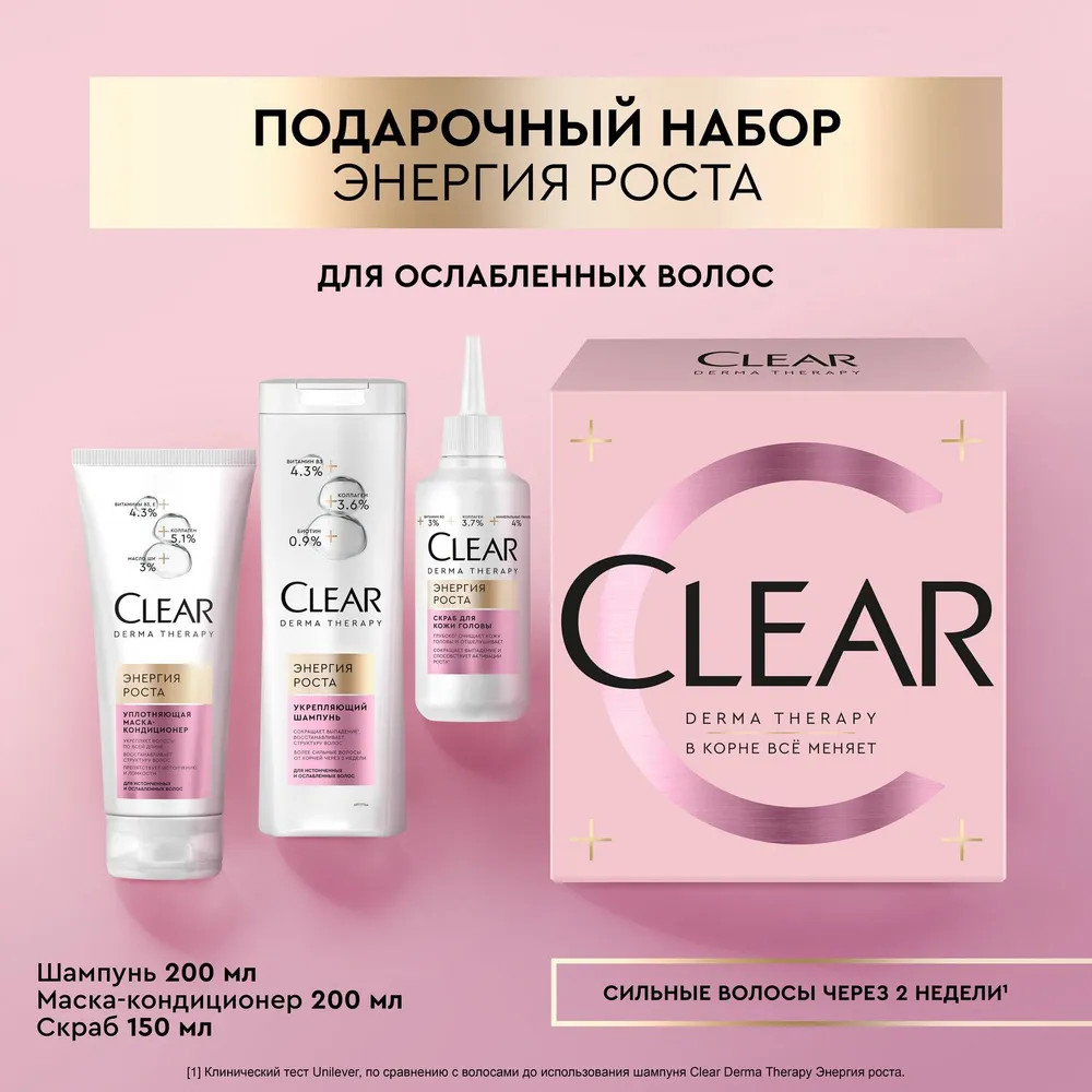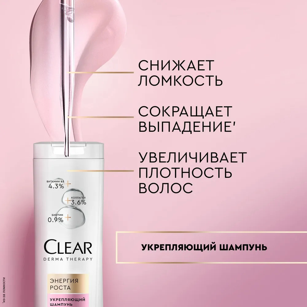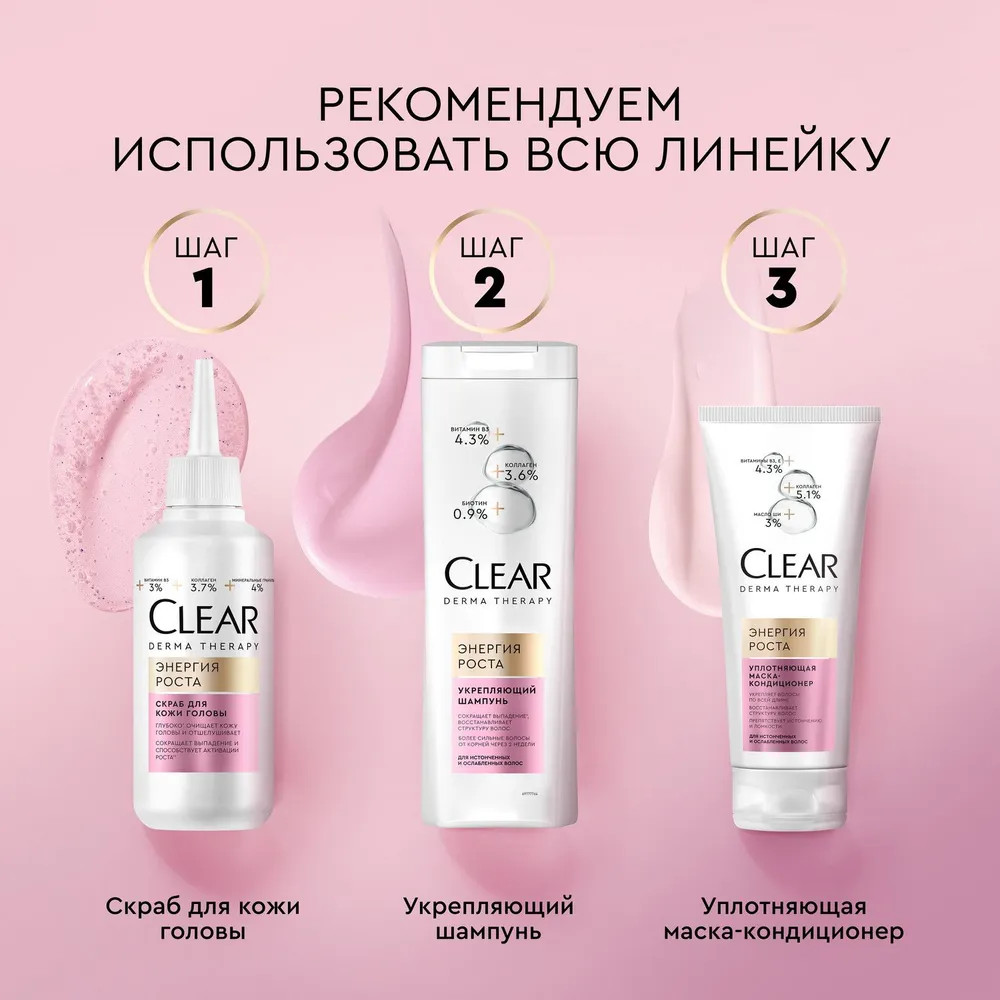 Шампунь: Aqua, Sodium Laureth Sulfate, Cocamidopropyl Betaine, Dimethiconol, Parfum, Sodium Chloride, Biotin, Glycerin, Helianthus Annuus (Sunflower) Seed Oil, Hydrolyzed Collagen, Niacinamide, Piroctone Olamine, Zinc Sulfate, Carbomer, Citric Acid, Guar Hydroxypropyltrimonium Chloride, Mica, Phenoxyethanol, PPG-8, Sodium Benzoate, Sodium Hydroxide, Sodium Salicylate, TEA-Dodecylbenzenesulfonate, Benzyl Salicylate, Linalool, CI 17200, CI 60730, CI 77891.