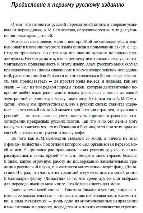 И хотя формулировка гипотезы Римана выглядит таинственной для непосвященных, автор книги сумел блестяще объяснить эту гипотезу, привлекая лишь элементарную математику, причем все необходимое объясняется по ходу дела. В книге в популярной форме рассказано о многих попытках доказать или опровергнуть гипотезу Римана, о судьбах математиков, одержимых этой задачей. Приводится много интересных исторических и биографических фактов. Книга раскрывает чарующую и интригующую взаимосвязь разных ветвей математики и научного поиска и передает восхитительный дух интеллектуальной свободы.