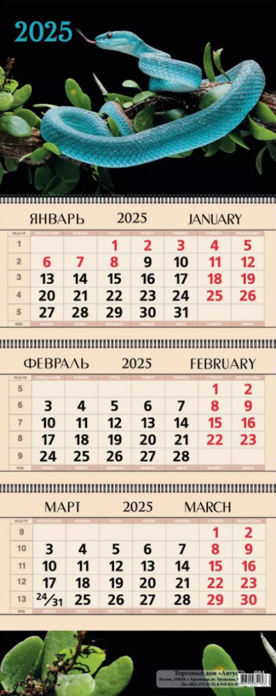 Календарь квартальный на 2025 год «Змея богатства»красивый удобный плотная бумага русские праздники офисный календарь меньше листов В данный момент этот товар отсутствует в продаже. Возможно, у нас найдется аналогичный или похожий товар здесь. Календарь трехблочный на 2025 год размером 295×730 мм состоит из красочного постера и трех блоков. Под каждым блоком — картонная подложка (плотностью 250 г/м2), третья из них цветная, повторяет фрагмент рисунка постера. Сам постер изготовлен из плотного мелованного картона плотностью 290 г/м2, покрыт глянцевой пленкой. Каждый блок размером 295×150 мм, включает 12 листов офсетной бумаги плотностью 80г/м2, закрепленных на металлическом гребне. Календарь оснащен люверсом (металлическим кольцом) для подвешивания и курсором-бегунком, который выделяет текущую дату. Упакован в полипропиленовый пакет с еврослотом. |