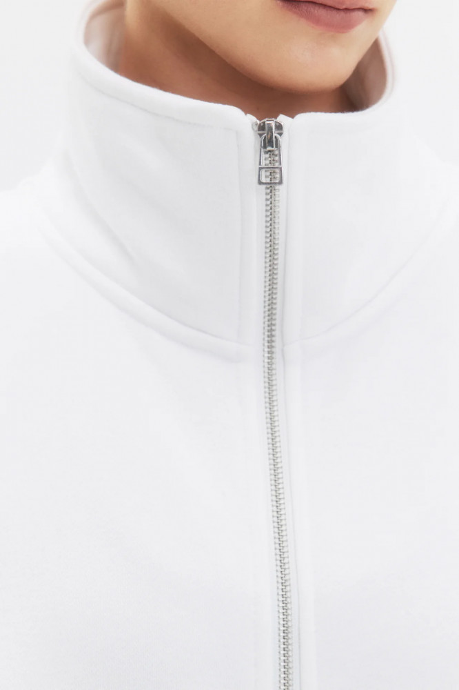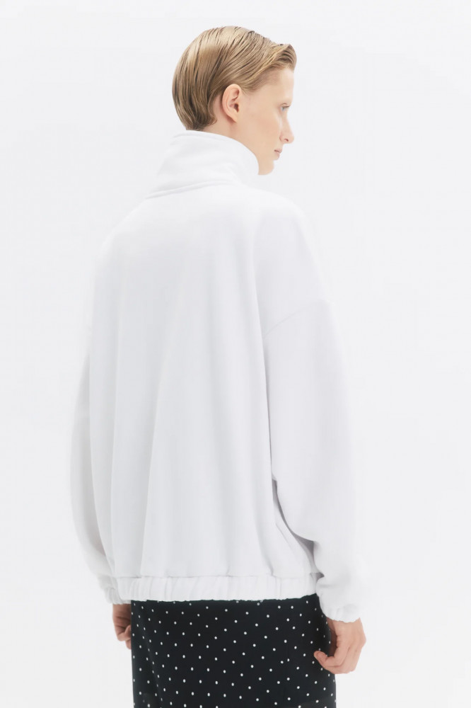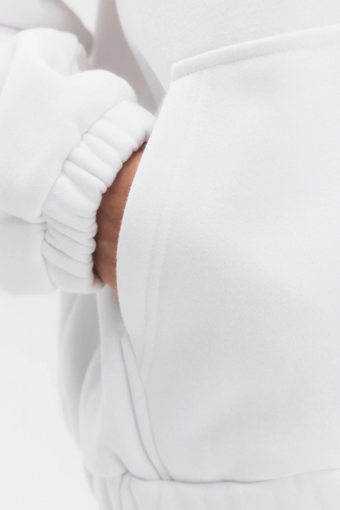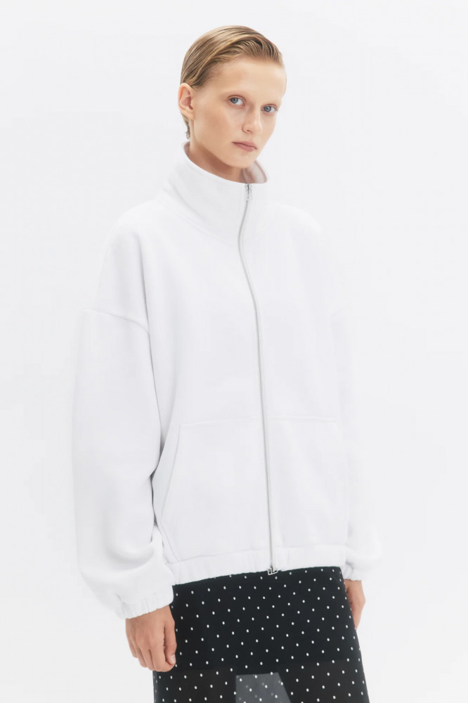Женское худи свободного кроя oversize из мягкого, приятного к телу футера на основе хлопка с начесом. Высокий воротник-стойка, который при желании можно носить как отложной воротничок с V-образным вырезом. Накладные карманы-кенгуру по бокам. Длинные свободные рукава с эластичными манжетами и спущенной линией плеча. Застежка на молнию с двойным бегунком. Присборенный нижний край на эластичной резинке.