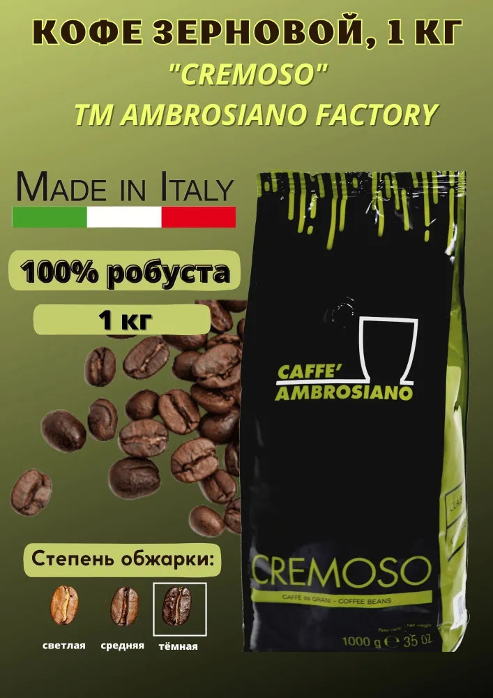 Caffe Ambrosiano Cremoso 1000 гр — зерновой кофе премиум линейки Caffe Antico Milano. Смесь, в составе которой есть 100% бразильская арабика и индонезийская робуста, создана, чтобы приготовить настоящий итальянский эспрессо. Кофе имеет мягкий, сладковатый, бархатистый вкус с нотками шоколада и долгое приятное послевкусие. Золотисто-коричневая обжарка придает напитку особенно тонкий и насыщенный аромат.