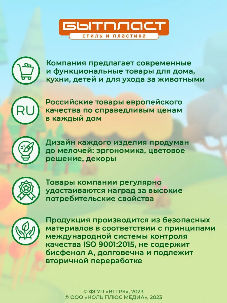| Компания «Бытпласт» — это ведущий российский производитель высококачественных изделий из пластика и пластмассы. Наша компания специализируется на создании разнообразных товаров для повседневной жизни, включая хозтовары, товары для дома и сада, детские товары, кухонные принадлежности и пластиковую посуду. Наш ассортимент разнообразен, и мы рады предложить оптовые поставки наших продуктов. Мы придерживаемся строгих стандартов качества при производстве всех наших товаров. Это гарантирует... |