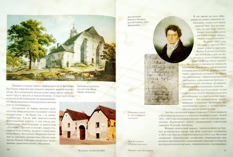 Великие композиторы. Жизнь и творчествоВ данный момент этот товар отсутствует в продаже. Возможно, у нас найдется аналогичный или похожий товар здесь. Серия: Рассказы о композиторах Книга предлагает юному читателю портреты шести великих композиторов. Иоганн Себастьян Бах (1685–1750) уже при жизни был известен как гениальный органист и композитор. Однако подлинный масштаб его гения начал осознаваться лишь следующими поколениями, и интерес к его личности и творчеству со временем только возрастает. Необыкновенный дар Моцарта (1756–1791) проявился очень рано — уже в шесть лет маленький гений очаровывал публику игрой на клавесине и скрипке. За свою короткую и блестящую жизнь он создал множество произведений, среди которых наиболее известны оперы «Свадьба Фигаро» и «Дон Жуан». Творческая мощь Людвига ван Бетховена (1770–1827), страстная сила, философская глубина и гуманистическая суть его сочинений кажутся еще более невероятными, если принять во внимание страшный недуг, поразивший творца еще в молодости, — его глухоту. Михаил Глинка (1804–1857) — родоначальник русской композиторской школы, все дальнейшие поколения русских музыкантов считали его своим учителем. Петр Ильич Чайковский (1840–1893) — самый известный русский композитор в мире, выдающийся представитель отечественной культуры. Семейная традиция предписывала Николаю Андреевичу Римскому-Корсакову (1844–1908) стать моряком, но незаурядное музыкальное дарование взяло верх, и в историю он вошел как выдающийся русский композитор, педагог, дирижер, общественный деятель, музыкальный критик. |