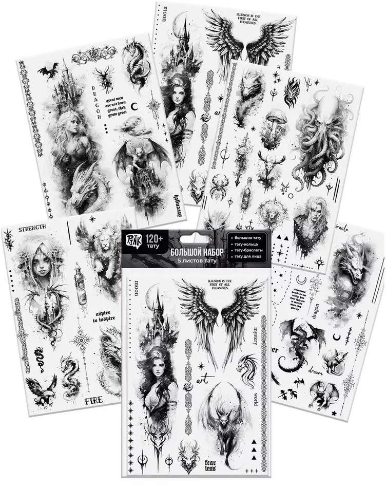 Новые большие наборы тату от бренда Pink из 5 листов размером А5 предоставляют бесконечные возможности для творчества. Уникальные тату наборы представлены в 6 разных стилях: фэнтези, цветы, минимализм, готика, восток и аниме. Необычные, детально прорисованные эскизы доставят Вам эстетическое удовольствие! |
