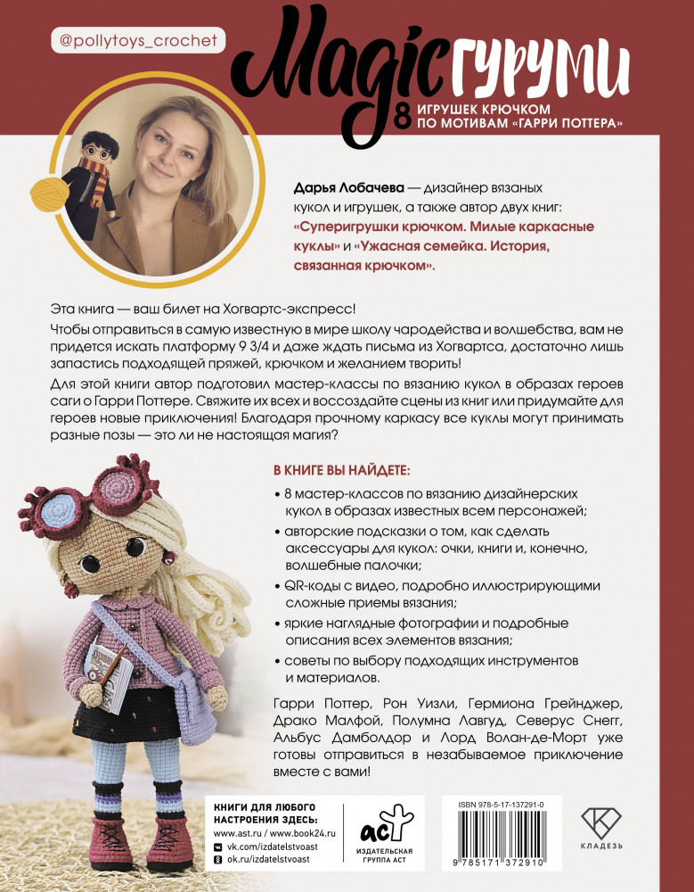 💳 Оплатить за товар можно при получении 🇰🇿 Есть бесплатная доставка по Казахстану от 1 дня 🎁 Копите бонусы с каждой покупки Серия: Рукоделие РуНета Свяжите героев саги о Гарри Поттере! В этой книге вы найдете 8 мастер-классов по вязанию дизайнерских кукол в образах известных всем персонажей: Гарри Поттера, Рона Уизли, Гермионы Грейнджер, Драко Малфоя, Полумны Лавгуд, Северуса Снегга, Альбуса Дамблдора и Лорда Волан-де-Морта! Свяжите их всех и воссоздайте сцены из книг или придумайте для героев новые приключения! Чтобы отправиться в самую известную в мире школу чародейства и волшебства, вам не придется искать платформу 9 3/4 и даже ждать письма из Хогвартса, достаточно лишь запастись подходящей пряжей, крючком и желанием творить! Дарья Лобачева — дизайнер вязаных кукол и игрушек, а также автор двух книг: «Суперигрушки крючком. Милые каркасные куклы» и «Ужасная семейка. История, связанная крючком». |
