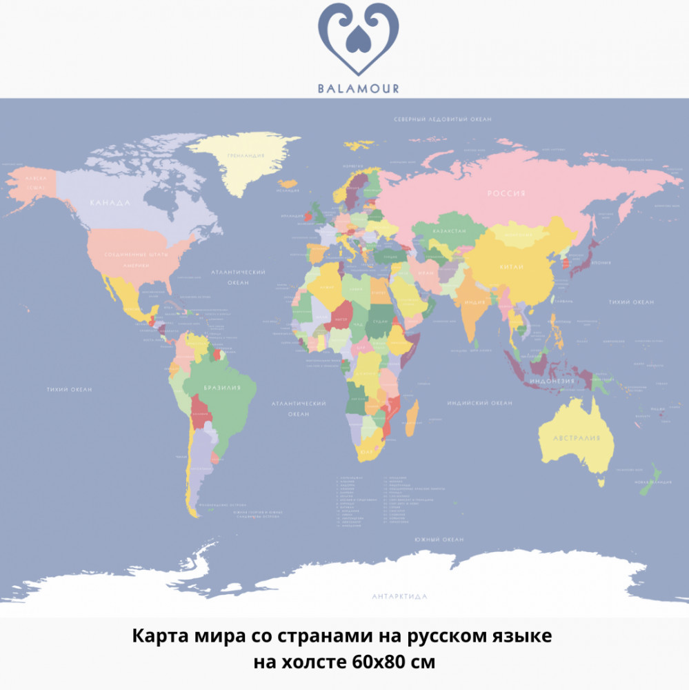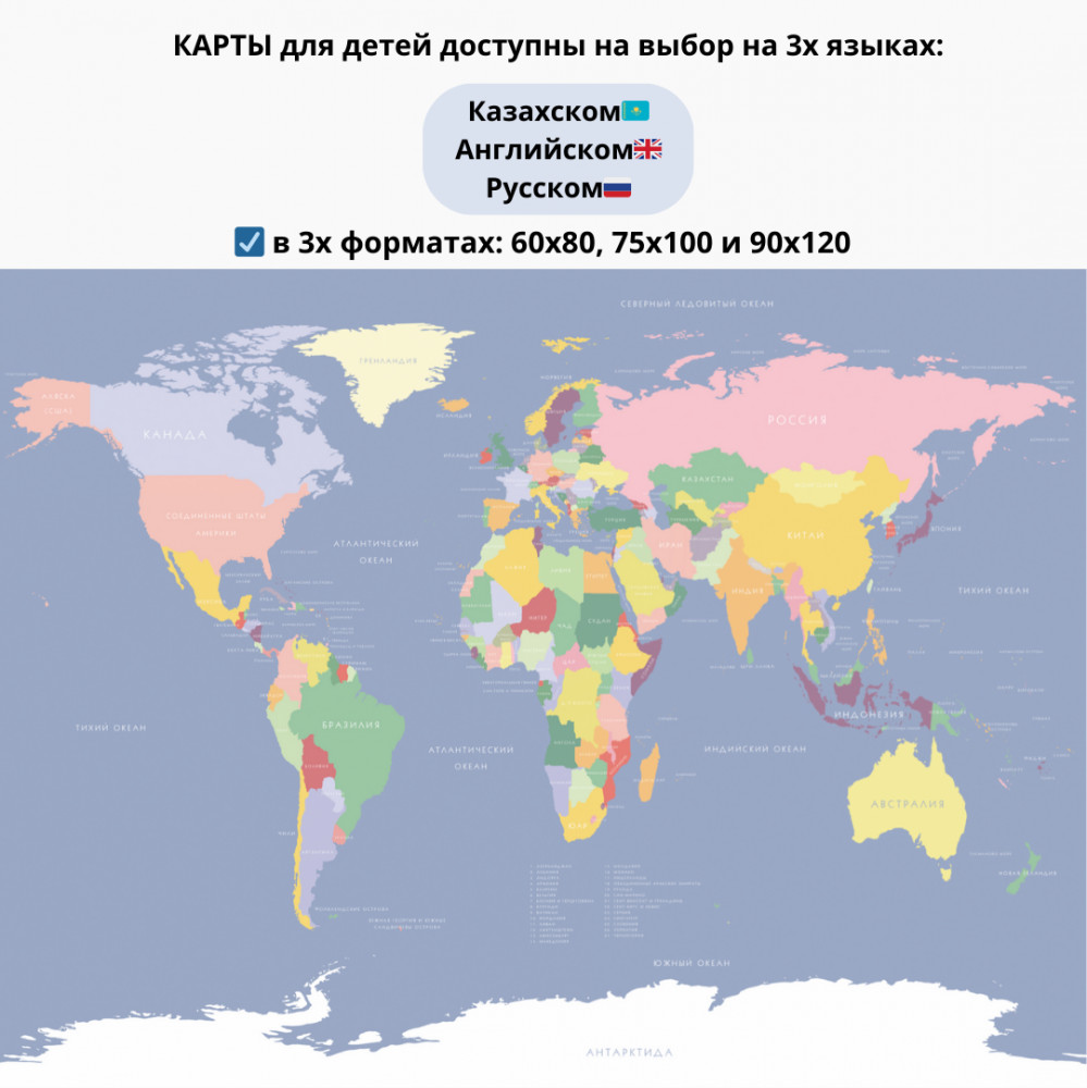 💳 Оплатить за товар можно при получении 🇰🇿 Есть бесплатная доставка по Казахстану от 1 дня 🎁 Копите бонусы с каждой покупки Карта мира со странами на русском языке на холсте (60×80 см)/ Карта мира от Balamour — это увлекательный и познавательный элемент, который поможет детям познакомиться с географией и культурным многообразием нашей планеты. |