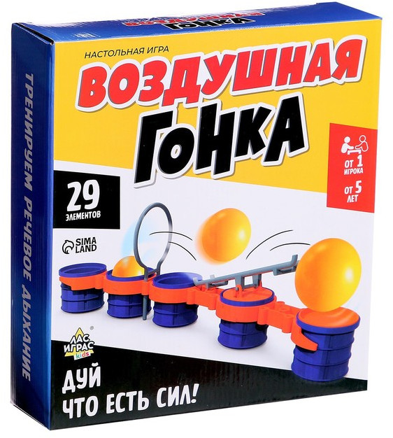 В настольной игре «Воздушная гонка» ребёнку предстоит дуть на шарик и регулировать силу выдоха, чтобы проходить различные сложные трассы. Благодаря такому способу тренируется речевое дыхание и отличная реакция! Настольная игра «Воздушная гонка» рекомендована для детей от 5 лет. Рассчитана на 1 игрока или неограниченное количество участников.
