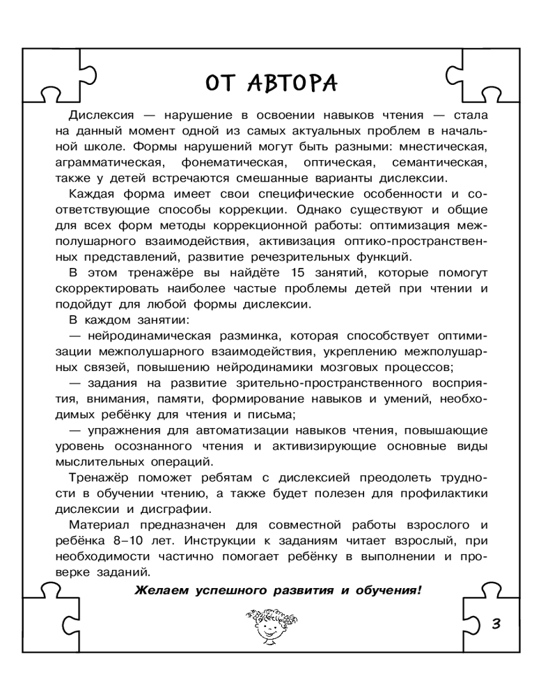 💳 Оплатить за товар можно при получении 🇰🇿 Есть бесплатная доставка по Казахстану 🎁 Копите бонусы с каждой покупки Серия: Экспресс-тренировка для мозга ребенка Опытный психолог и педагог Т. Трясорукова поможет справиться с одной из самых распространённых проблем младших школьников — дислексией. Увлекательные игровые задания не только помогут избавиться от ошибок при чтении и письме, но и научат вашего ребёнка анализировать и систематизировать информацию, помогут лучше понимать прочитанное. Тренажёр позволит улучшить внимание и память, сформирует новые и укрепит уже имеющиеся межполушарные связи и улучшат работу мозга. Для младшего школьного возраста. |