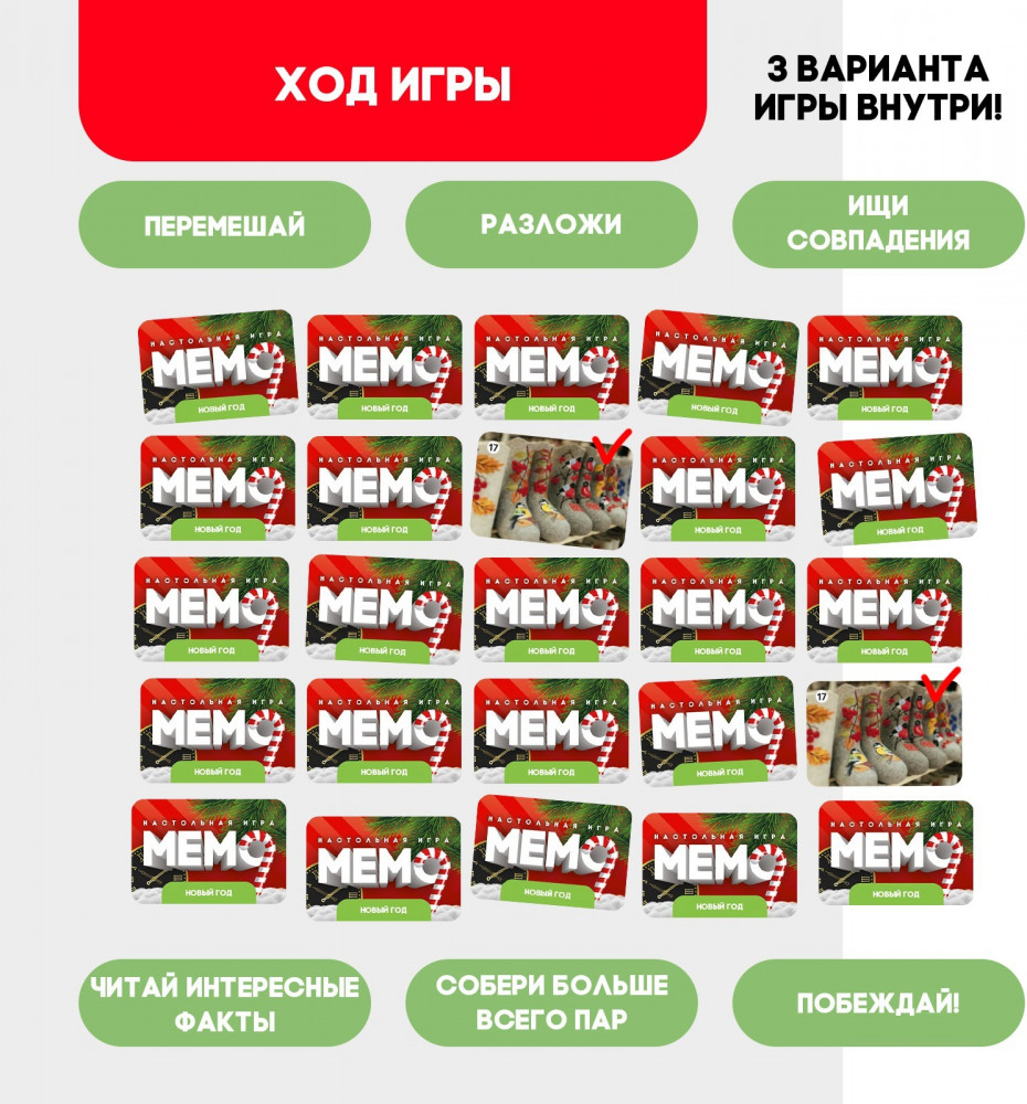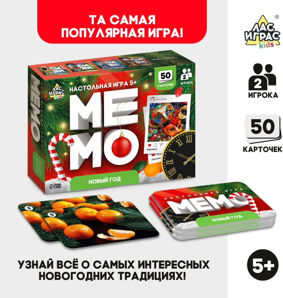 💳 Оплатить за товар можно при получении 🇰🇿 Есть бесплатная доставка по Казахстану от 1 дня 🎁 Копите бонусы с каждой покупки Серия: Kids Расширяйте кругозор, тренируйте память и внимательность с познавательной игрой-мемо «Новый год»! Такая настолка не только развлечёт ребёнка, но и позволит потренировать важные навыки, а также закрепить знания, полученные в школе. Настольная игра-мемо «Новый год» рекомендована для детей от 5 лет и рассчитана на 2 игроков. |