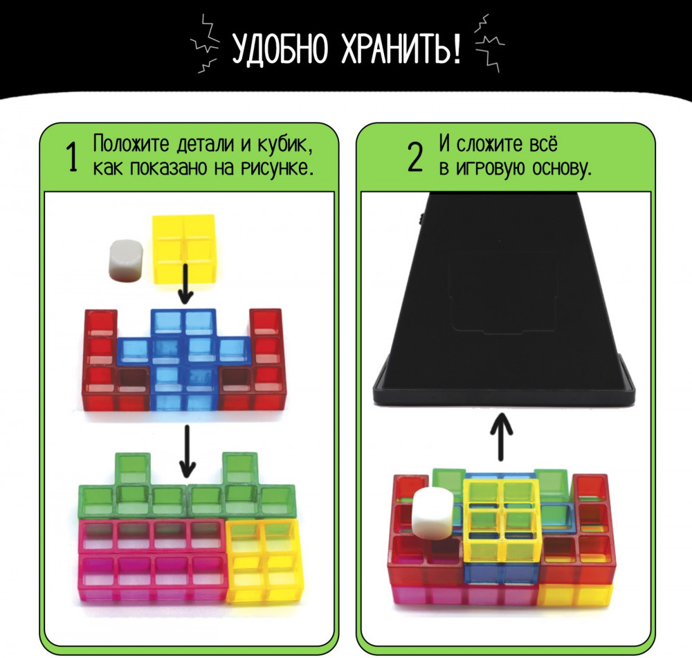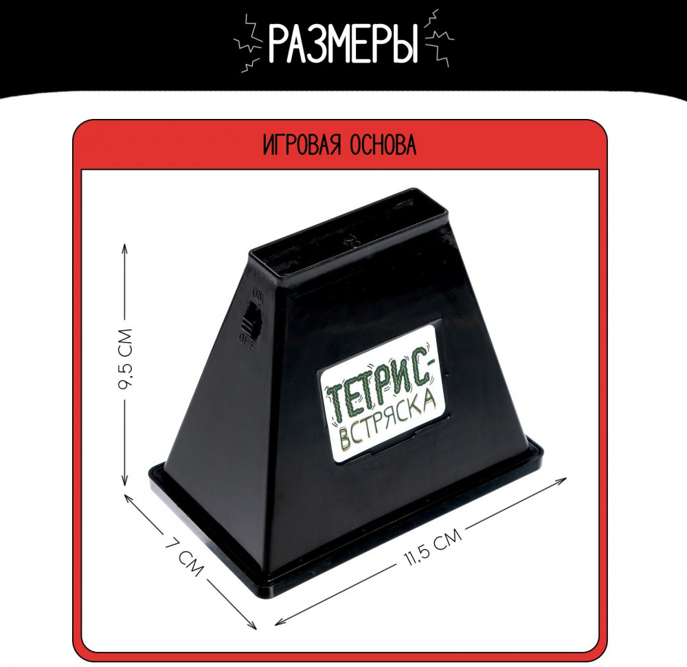 • элементы тетриса из пластика, размеры одной фигуры от 3 × 3 × 1.5 до 1.5 × 1.5 × 6 см.;