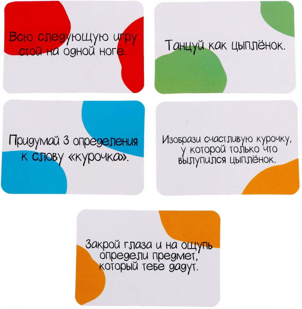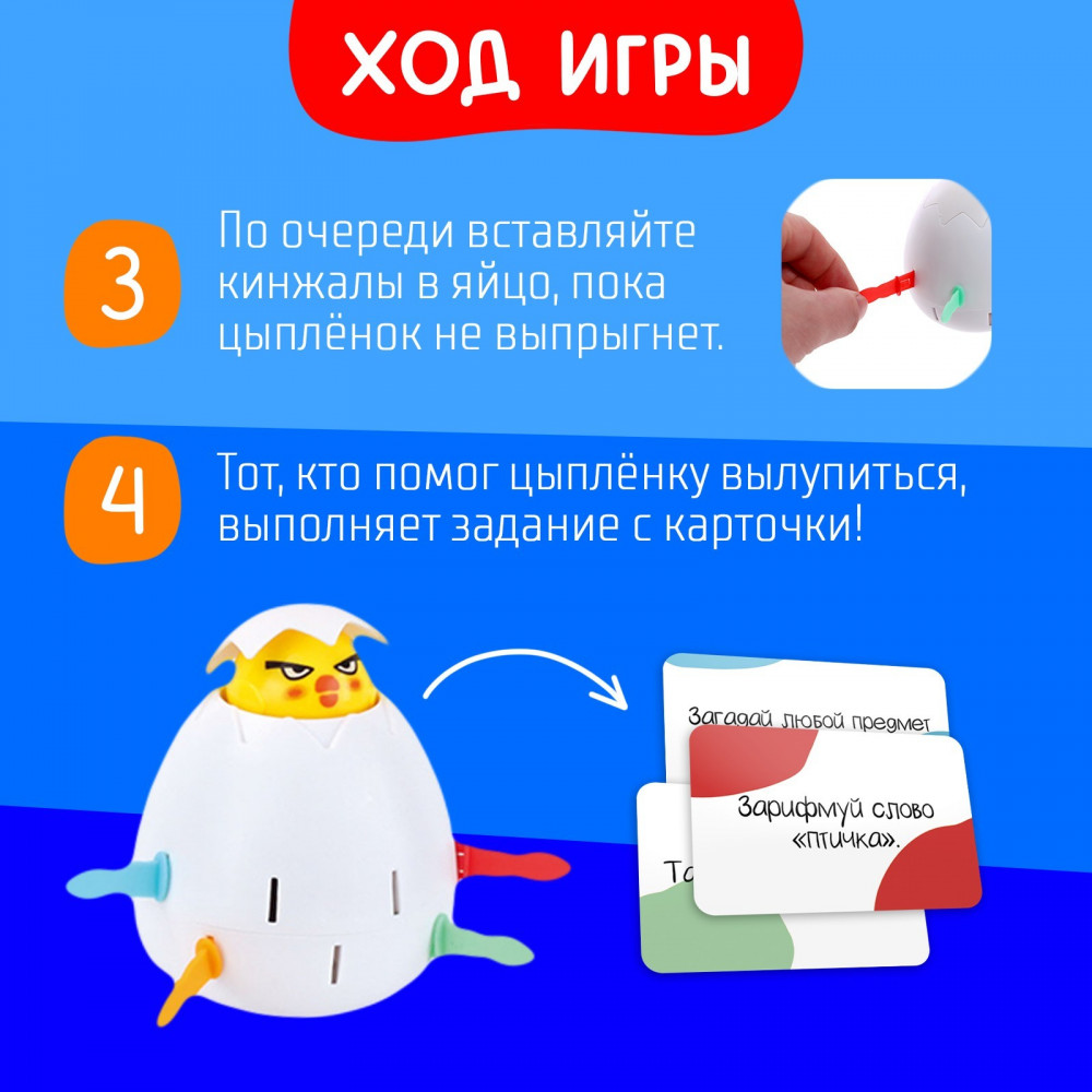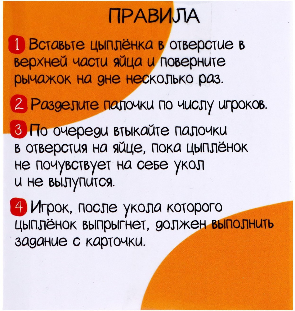 💳 Оплатить за товар можно при получении 🇰🇿 Есть бесплатная доставка по Казахстану от 1 дня 🎁 Копите бонусы с каждой покупки Серия: Kids Проверьте свою удачу — сыграйте в «Яйцо навылет»! Ваша задача — заставить цыплёнка покинуть скорлупу, а затем выполнить задание с карточки. Вставьте цыплёнка в отверстие в верхней части яйца и поверните рычажок на дне несколько раз. Разделите палочки по числу игроков. По очереди втыкайте палочки в отверстия на яйце, пока цыплёнок не почувствует укол и не вылупится. Игрок, после которого цыплёнок выпрыгнет, выполняет задание с карточки. |
