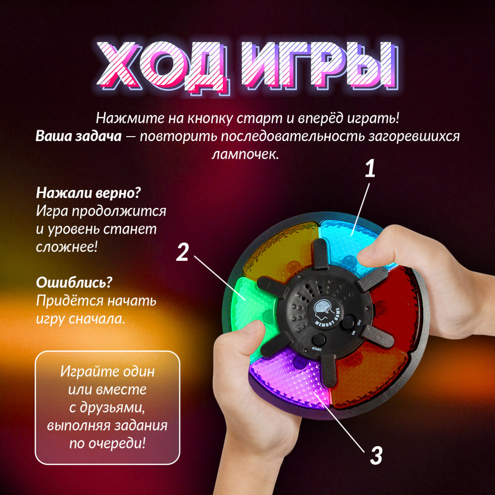 💳 Оплатить за товар можно при получении 🇰🇿 Есть бесплатная доставка по Казахстану от 1 дня 🎁 Копите бонусы с каждой покупки Серия: Kids «Мемо-игра» — настольная игра, тренирующая память. Кнопочку нажимайте и цвет запоминайте! Следите за тем, в каком порядке загораются кнопочки, а затем правильно повторяйте последовательность мигающих цветов. С каждым верным выбором цвета уровень усложняется, а вы приближаетесь к победе! Эта интерактивная игра поможет детям легко запомнить цвета. Она тренирует внимание, зрительную память, скорость реакции. Игра очень компактная — возьмите её с собой, и она займёт малыша в долгом путешествии! Рекомендовано детям старше 6 лет. |