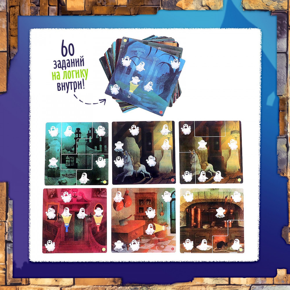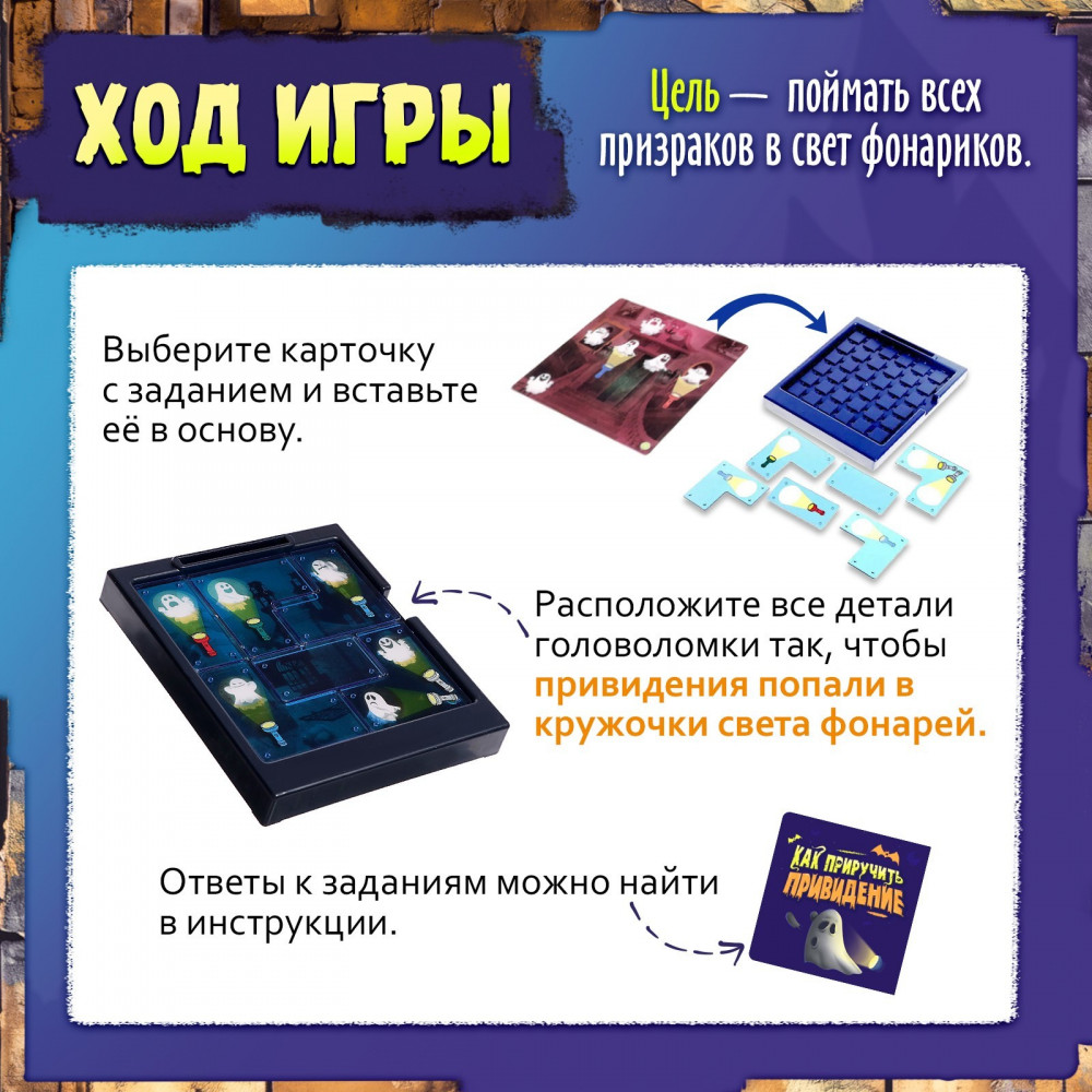 Расположите все детали головоломки так, чтобы всех привидений было видно в кружочках света. Полупрозрачные голубые части деталей и части с фонариками не должны перекрывать привидений. Все детали головоломки должны лежать изображениями вверх. Для каждого задания есть 1 решение. Ответы к заданиям посмотрите в брошюре. Только не заглядывайте туда раньше времени, иначе играть будет не так интересно. Игра включает в себя 3 уровня: новичок, юниор и мастер.