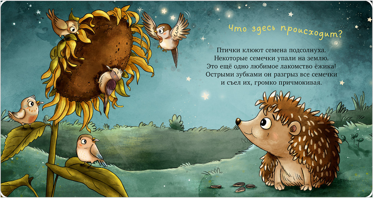 Малыш-ежик вышел прогуляться вечером, поел гусениц и жучков, спрятался от собаки, свернувшись в колючий клубок, и отправился спать, когда над садом взошло солнце. В конце книги перечислены все интересные факты о том, как живут ежи в природе.