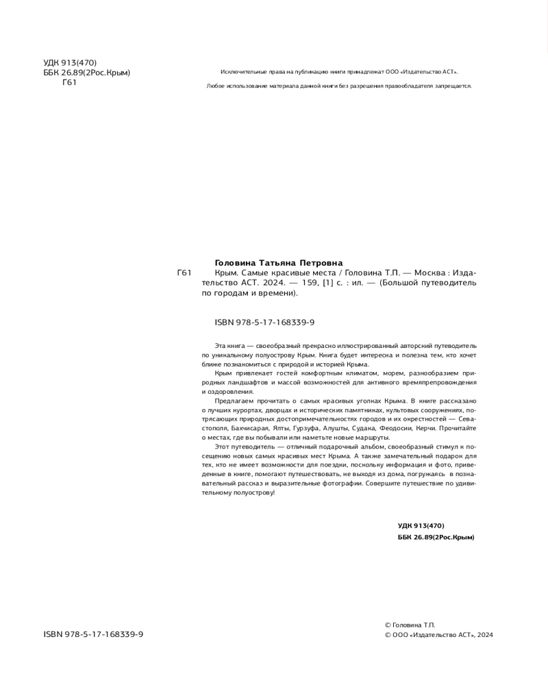 💳 Оплатить за товар можно при получении 🇰🇿 Есть бесплатная доставка по Казахстану от 1 дня 🎁 Копите бонусы с каждой покупки Серия: Большой путеводитель по городам и времени Эта книга — своеобразный прекрасно иллюстрированный авторский путеводитель по уникальному полуострову Крым. Книга будет интересна и полезна тем, кто хочет ближе познакомиться с природой и историей Крыма. Крым привлекает гостей комфортным климатом, морем, разнообразием природных ландшафтов и массой возможностей для активного времяпрепровождения и оздоровления. Предлагаем прочитать о самых красивых уголках Крыма. В книге рассказано о лучших курортах, дворцах и исторических памятниках, культовых сооружениях, потрясающих природных достопримечательностях городов и их окрестностей — Севастополя, Бахчисарая, Ялты, Гурзуфа, Алушты, Судака, Феодосии, Керчи. Прочитайте о местах, где вы побывали или наметьте новые маршруты. |