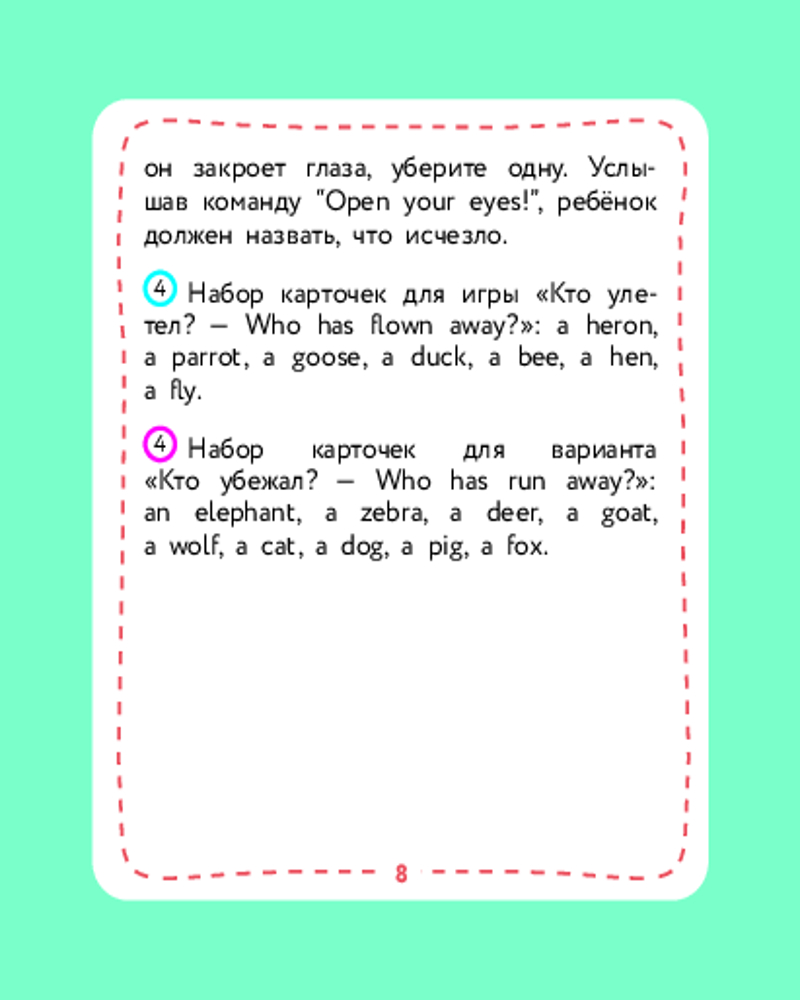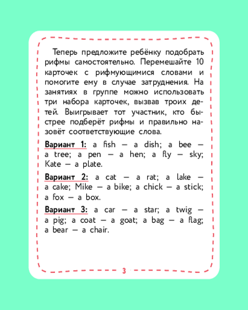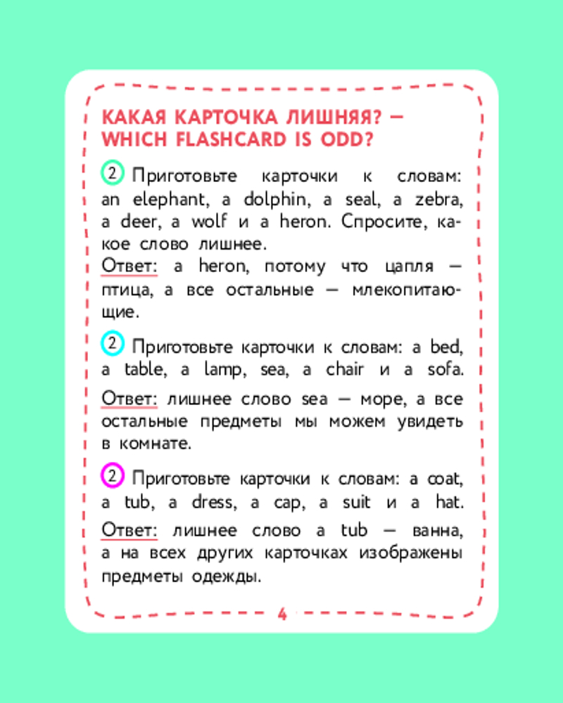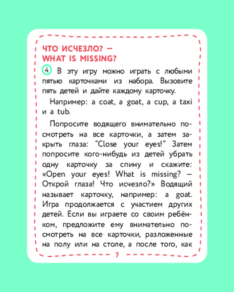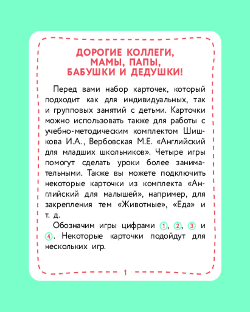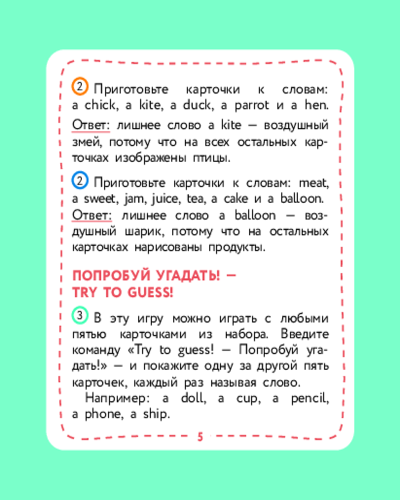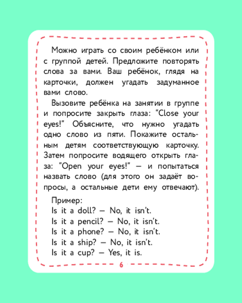 💳 Оплатить за товар можно при получении 🇰🇿 Есть бесплатная доставка по Казахстану от 1 дня 🎁 Копите бонусы с каждой покупки Серия: Английский детям с Ириной Шишковой Не все дети любят книги. И учиться тоже любят не все — потому что «ску-у-у-учно». С этими карточками скучно не будет! С ними можно осваивать английские слова в увлекательной игре — а точнее, в нескольких играх! Родителям не придется их изобретать: автор уже придумала 4 игры и составила понятные инструкции для родителей на 4-х карточках комплекта. Организовать занятие для одного ребенка или нескольких детей сможет любой взрослый, владеющий основами английского языка! Играйте, запоминайте слова и открывайте для себя увлекательный мир английского языка! |