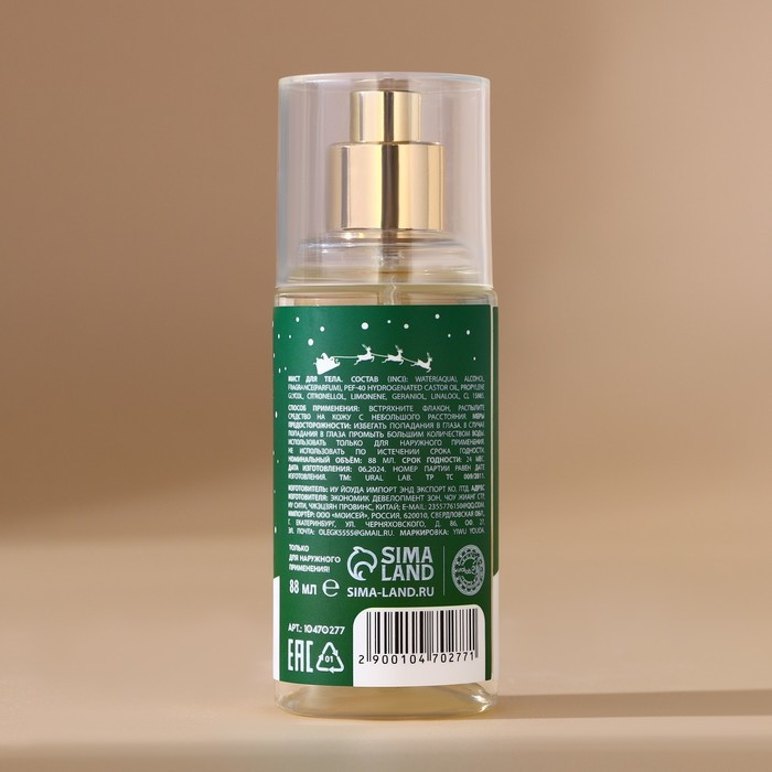 Парфюмированный мист для тела — это не просто аромат, это источник хорошего настроения весь день где бы вы ни были! Добавьте ярких моментов в свою жизнь с парфюмированным спреем, который можно использовать в любое время и в любом месте. Глубокий и насыщенный аромат, создаёт атмосферу тепла и уюта. Небольшой объём флакона позволяет брать его с собой.