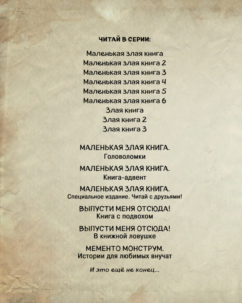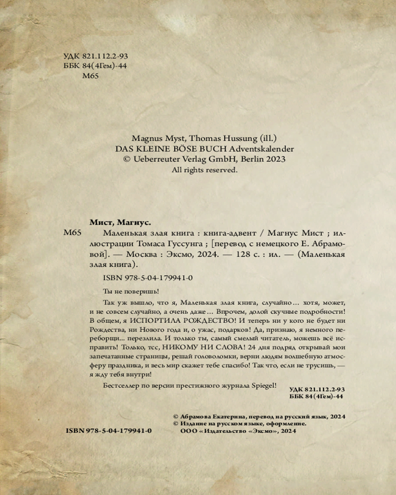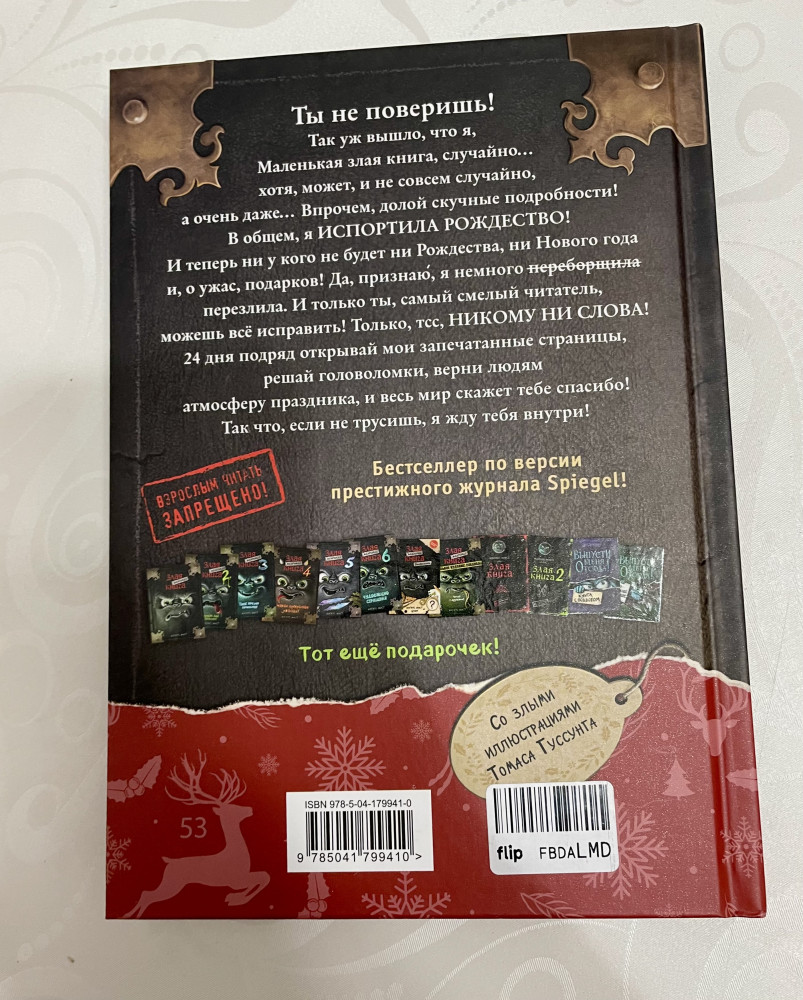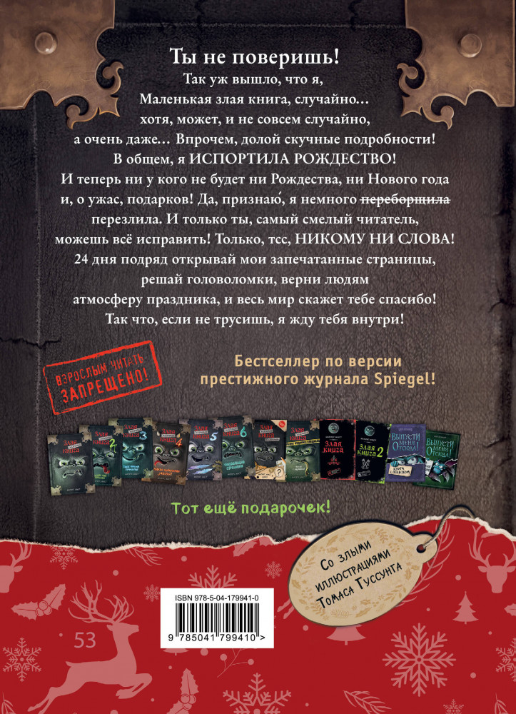 Маленькая злая книга. Книга-адвентВ данный момент этот товар отсутствует в продаже. Возможно, у нас найдется аналогичный или похожий товар здесь. Серия: Маленькая злая книга «Маленькая злая книга» снова удивляет! Фишка этого издания — запечатанные страницы, которые нужно открывать строго по 2 день (и так 24 раза!). Но что осталось неизменным — так это весёлые приключения, неожиданные повороты сюжета, разнообразные задания и встречи с удивительными героями. В специальном издании юным читателям предстоит прийти на выручку Санта Клаусу и эльфам и даже сделать одно доброе дело. Это отличный новогодний подарок для всех фанатов «Маленьких злых книг»! |