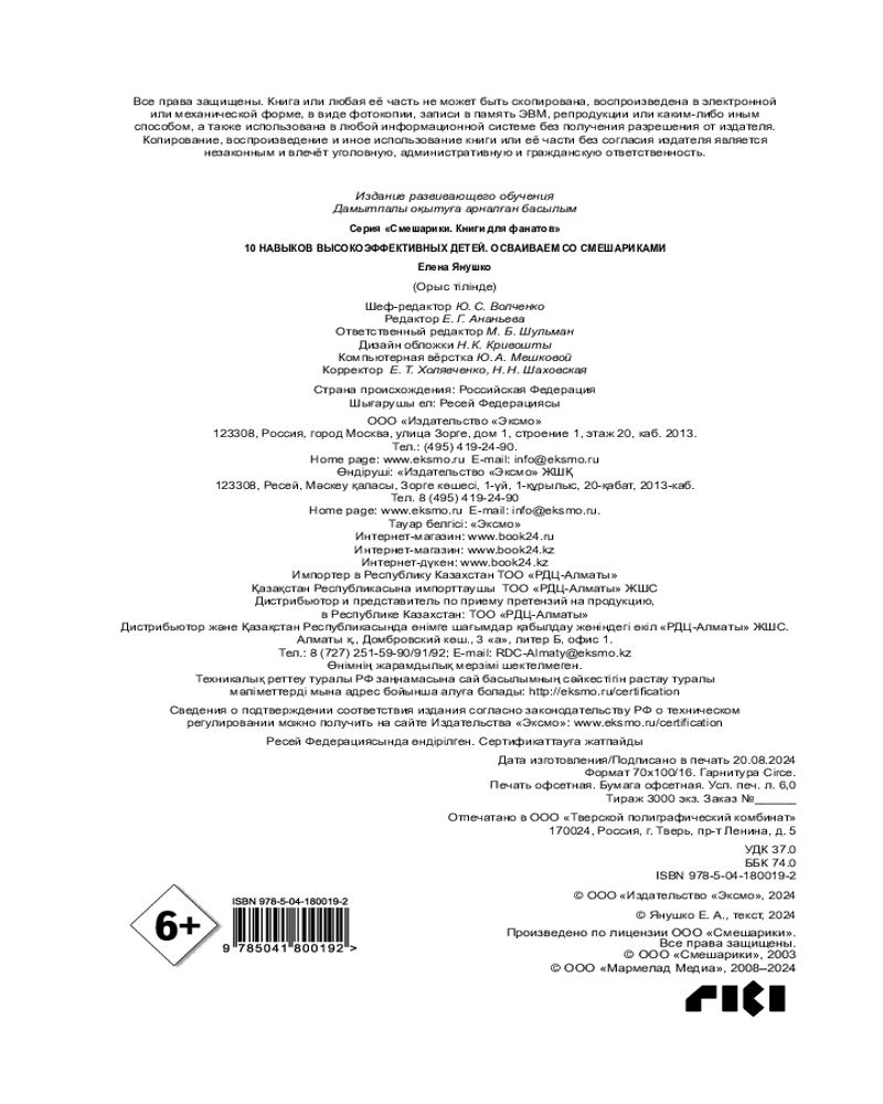 💳 Оплатить за товар можно при получении 🇰🇿 Есть бесплатная доставка по Казахстану 🎁 Копите бонусы с каждой покупки Серия: Смешарики. Книги для фанатов В этой книге детский педагог Елена Янушко предложит практические советы по формированию у ребёнка 8–11 лет десяти важных навыков, которые повысят его эффективность в школе, а затем и взрослой жизни, а любимые персонажи из мультсериала «Смешарики» помогут лучше понять ребенку, как: |
