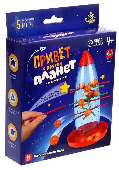 💳 Оплатить за товар можно при получении 🇰🇿 Есть бесплатная доставка по Казахстану от 1 дня 🎁 Копите бонусы с каждой покупки Серия: Игры на везение «Привет с других планет» — настольная игра для детей от 4 лет. Увлекательная настолка приглашает отправиться в захватывающее космическое путешествие. Но чтобы отправиться в полёт, нужно разгрузить ракету. Развивайте с малышом смекалку и ловкость: вперёд, навстречу приключениям! |
