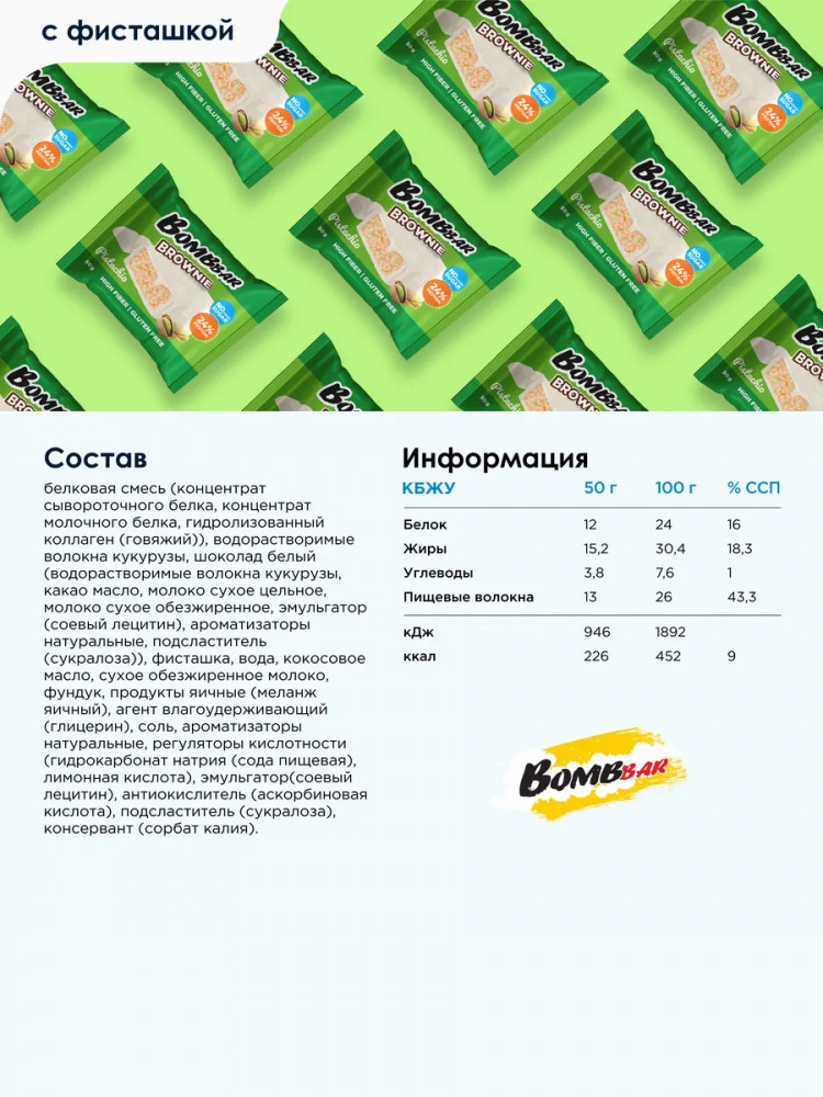 Bombbar Протеиновое печенье брауни без сахара «Фисташка»